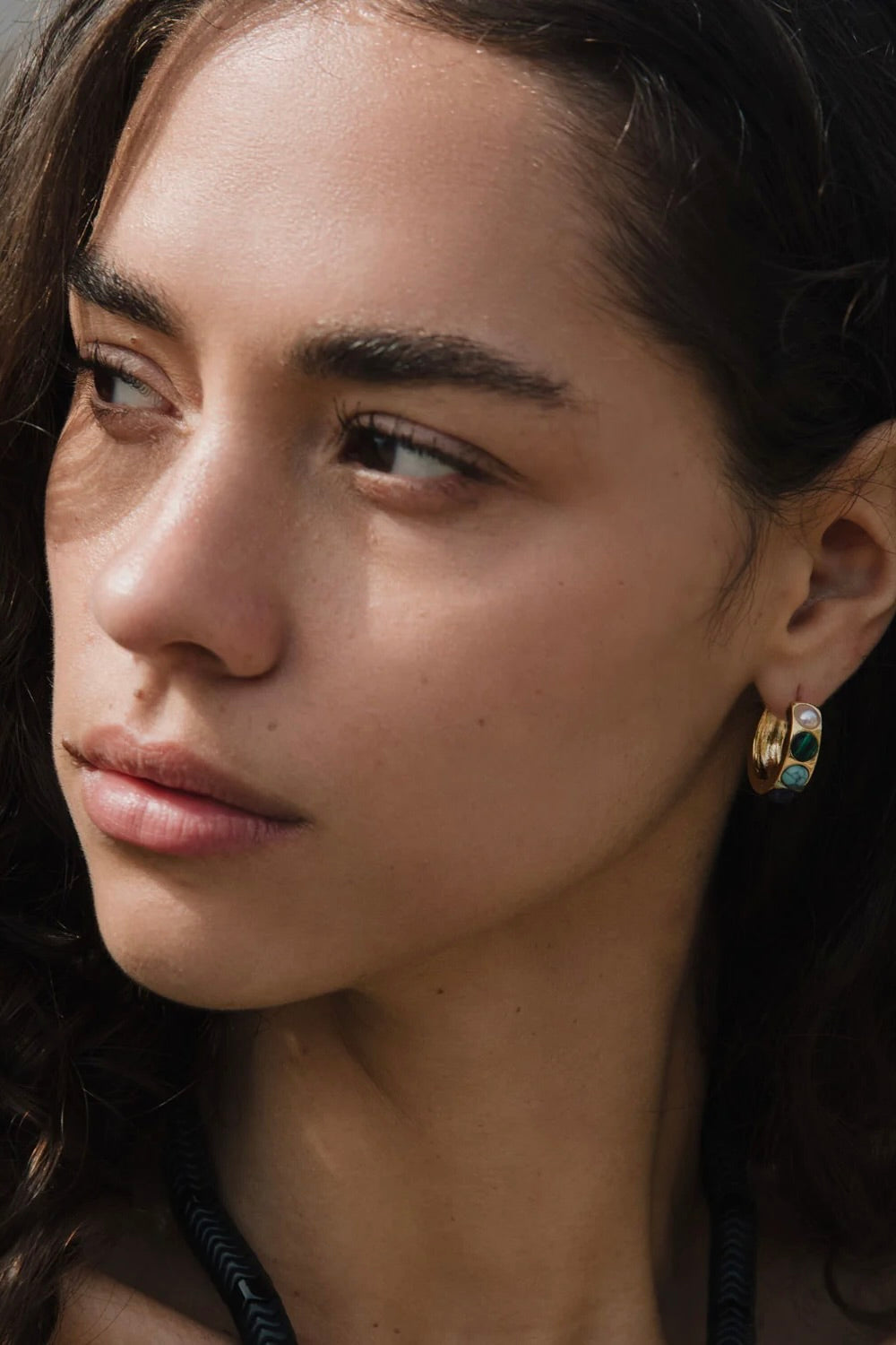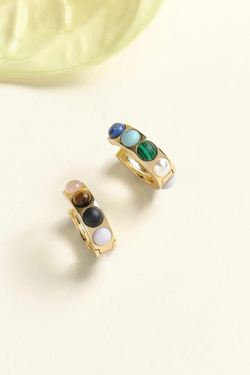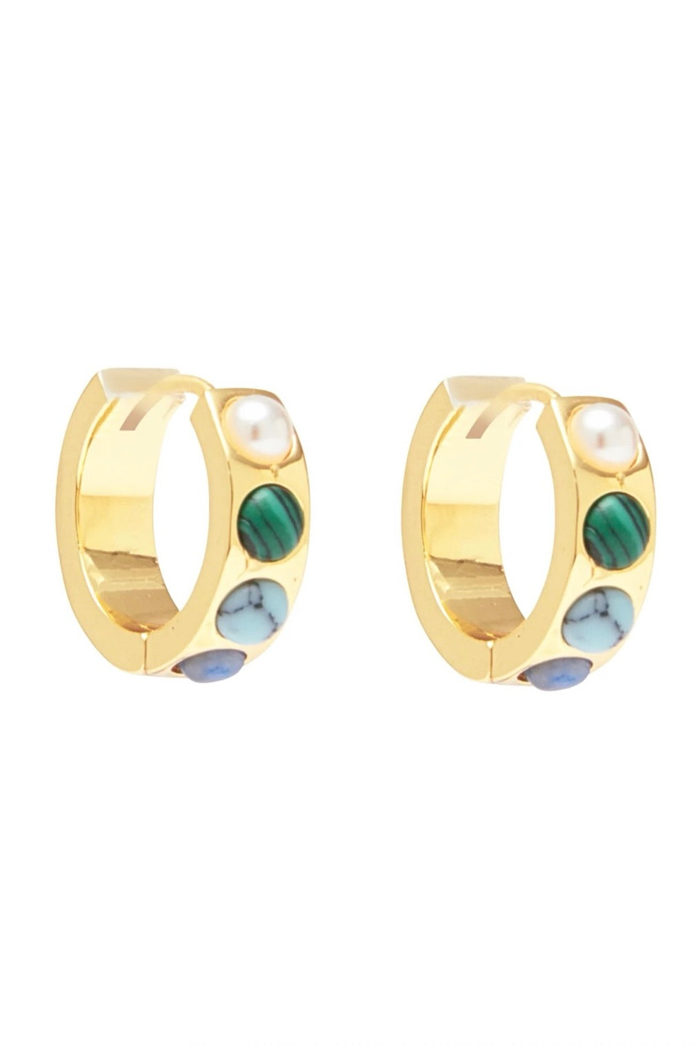 Dainty hoops with an assortment of semiprecious stones of rose quartz, turquoise, pearl, malachite, and jasper. For added MG allure, the backside of the earring features different colors and could actually be flipped around and worn backwards!
