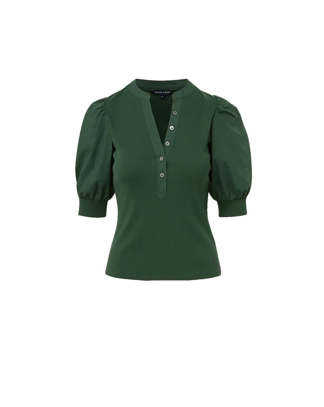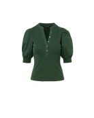 Crafted from premium stretch cotton in deep hunter green, it features elbow-length puff sleeves that exude soft romance. The ribbed body offers a relaxed fit and is finished with a shortened five-button placket. A new favorite in the making—it’s perfect with denim, skirts, and tailored trousers alike.