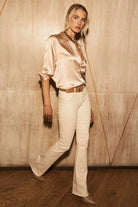 A sleek, slim bootcut, fitted through the hips and knee, built with a contoured waistband that securely hugs the natural waist without gaping. Now back in a neutral leather-look coated denim.