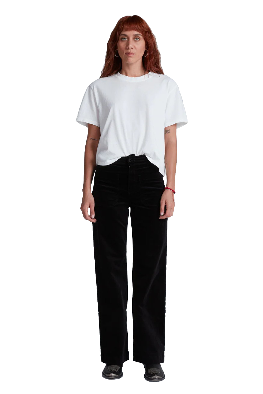 The classic silhouette featuring a high rise, relaxed wide leg, and iconic sailor pocket details. The Sailor is reimagined in soft stretch velvet, offering a luxurious update to this timeless shape. Designed with clean patch pockets and a cropped inseam, it balances vintage inspiration with modern versatility—perfect for both day and evening wear.