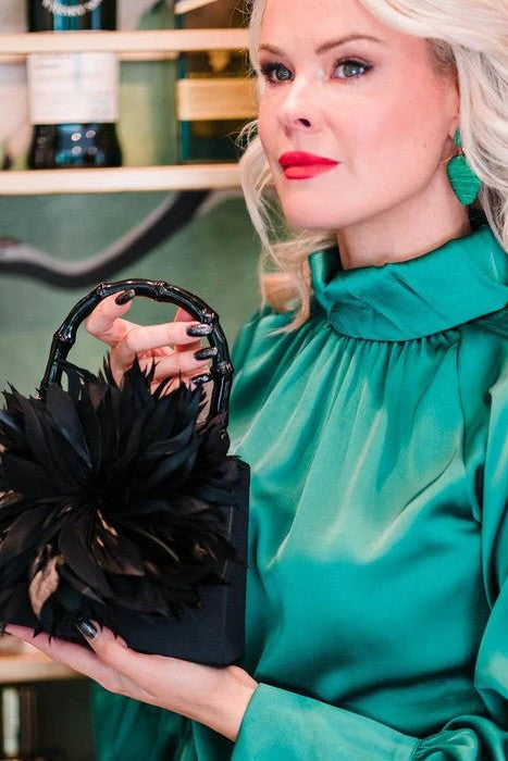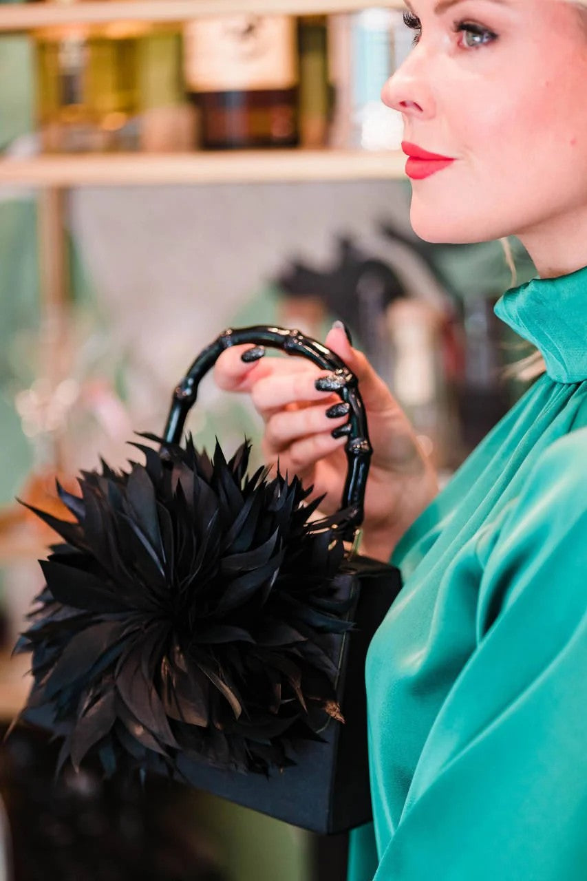 Lulu is a small black faille handbag featuring a large feather adornment. With an array of bold color choices, you will be the star of the event with a bag that matches your style!