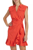 Show off your style in the Zenni Dress. This mini dress features a flounce skirt and collared neckline for a chic and sophisticated look. With a sleeveless design and fit and flare cut, it's perfect for any occasion. The Sadie Stretch fabrication adds comfort and versatility. Elevate your wardrobe with this must-have piece.