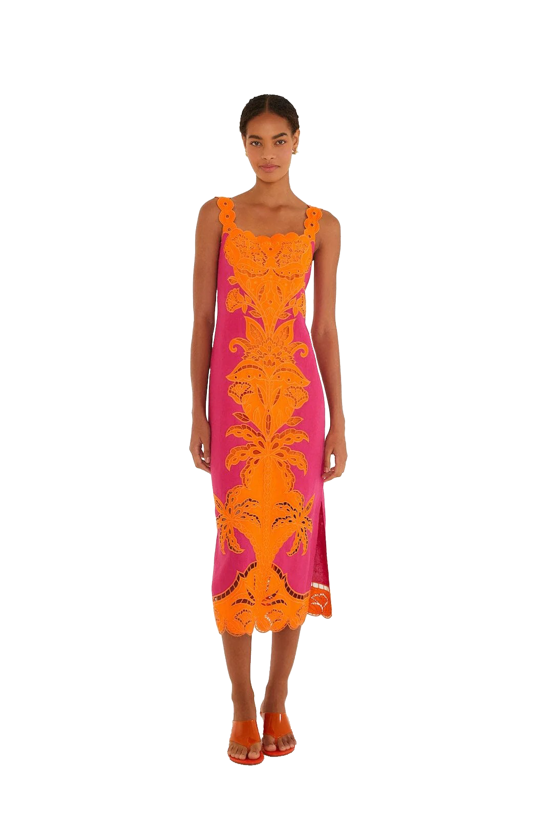 Embrace effortless elegance with the Pinke Cutwork Euroflax™ Premium Linen Midi Dress by FARM Rio. Crafted from breathable, responsibly sourced Euroflax™ linen, this dress features a flattering square neckline and delicate cutwork embroidery that adds artisanal charm. Its flowing midi silhouette moves gracefully, while the soft pink hue evokes warmth and playfulness. Perfect for sunny days, it celebrates sustainable luxury with a light, airy feel and timeless Brazilian spirit.