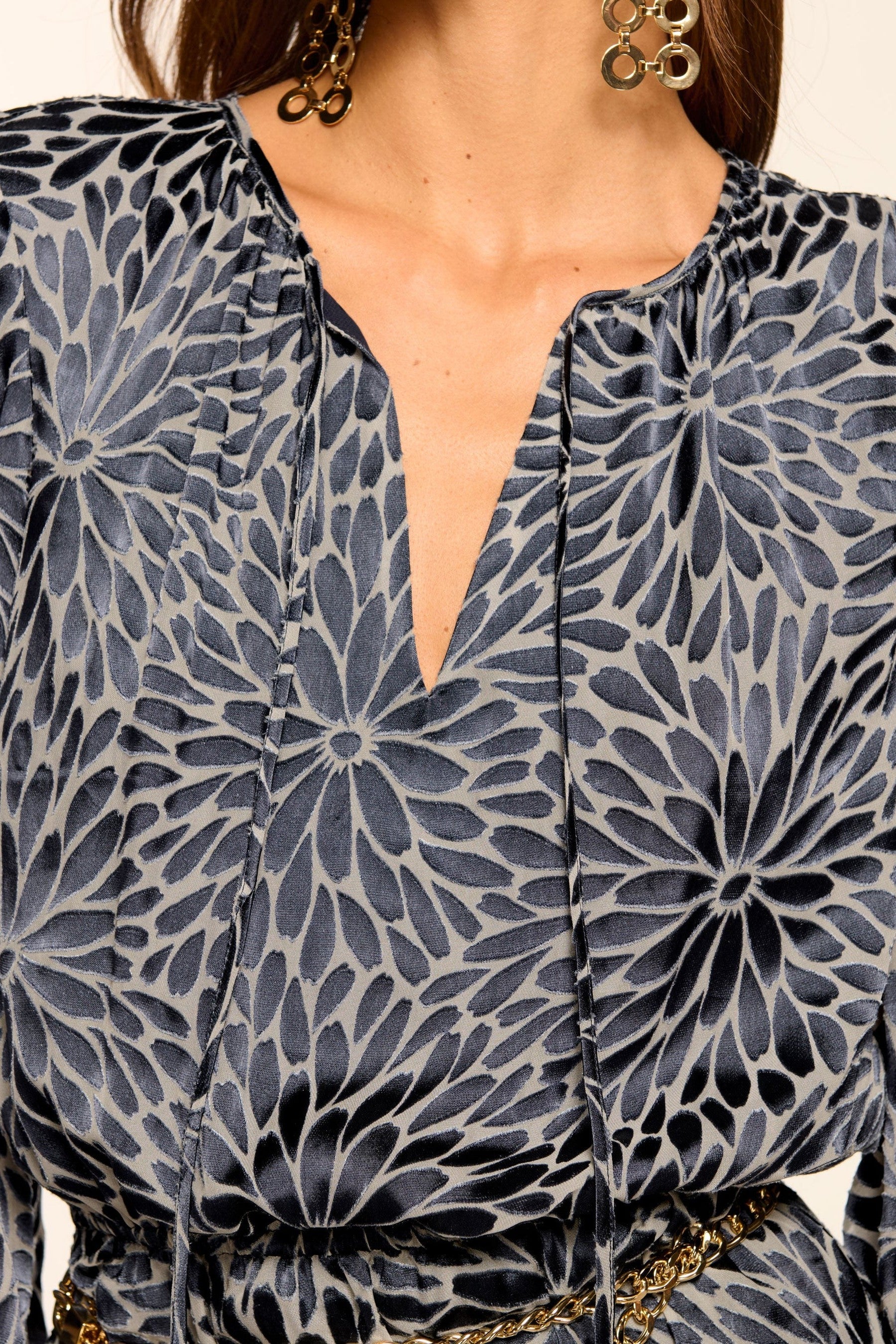 Floral burnout satin catches light beautifully in this blouson silhouette. The Marianna's elastic waist creates effortless shape while ruffle details add movement to the V-neck and long sleeves. Perfect for transitional seasons, evening celebrations, and moments that call for romance.
