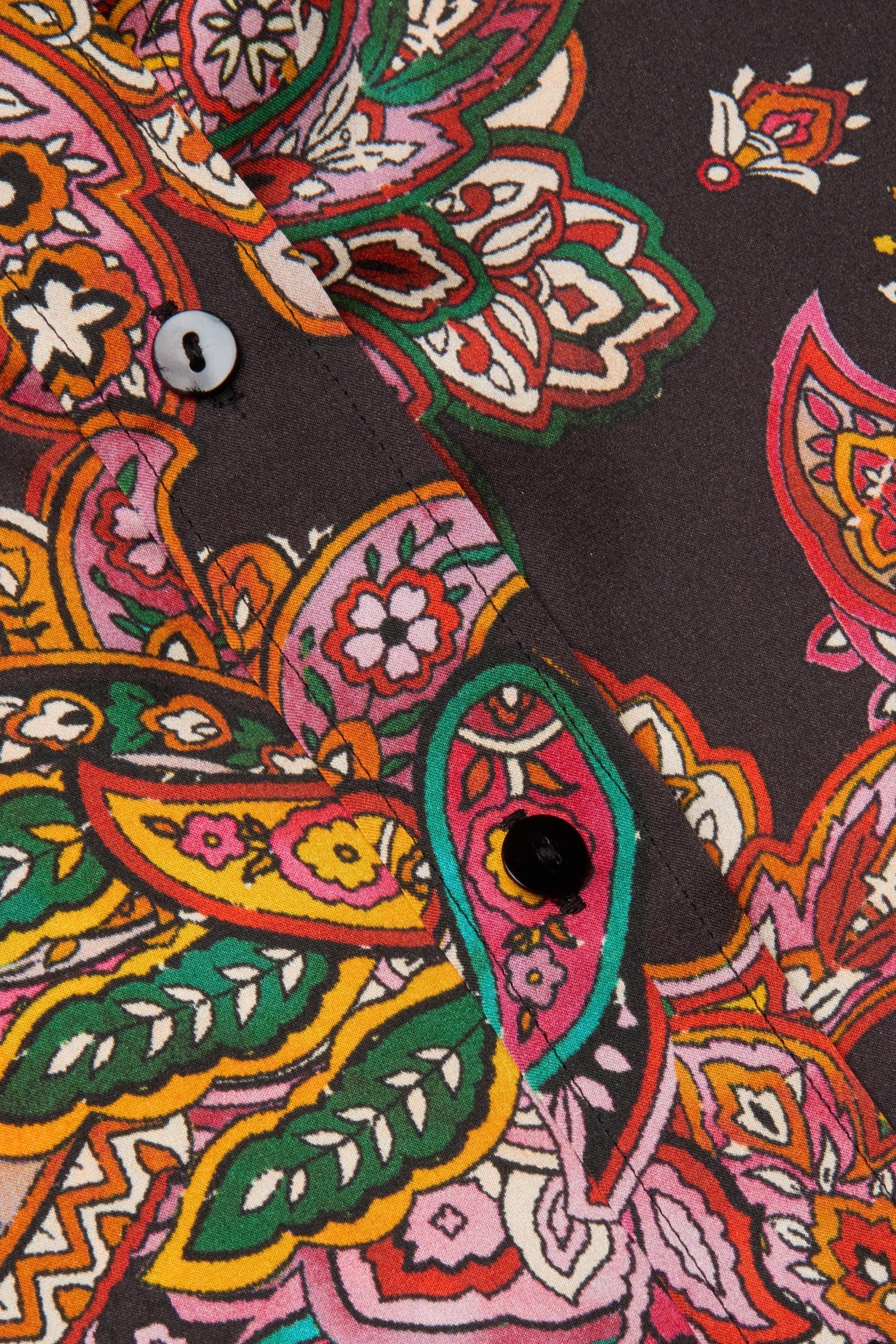 The iconic silk button-down that belongs in every wardrobe. This signature three-quarter sleeve shirt is back in black with a colorful paisley print.