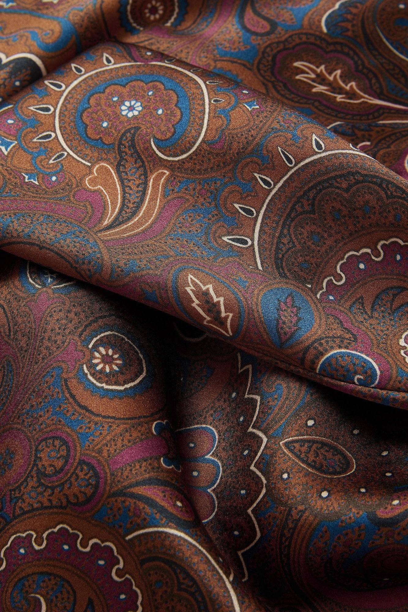 An elegant blouse with desk-to-dinner versatility. Crafted from brown, paisley-printed stretch-silk satin, the Francine blouse is cut for a fluid, relaxed fit and features a deep V-neckline with a dramatic tie-front detail. Wide, buttoned cuffs complete the look. Tuck it into relaxed wide-leg denim or sharp, tailored trousers.