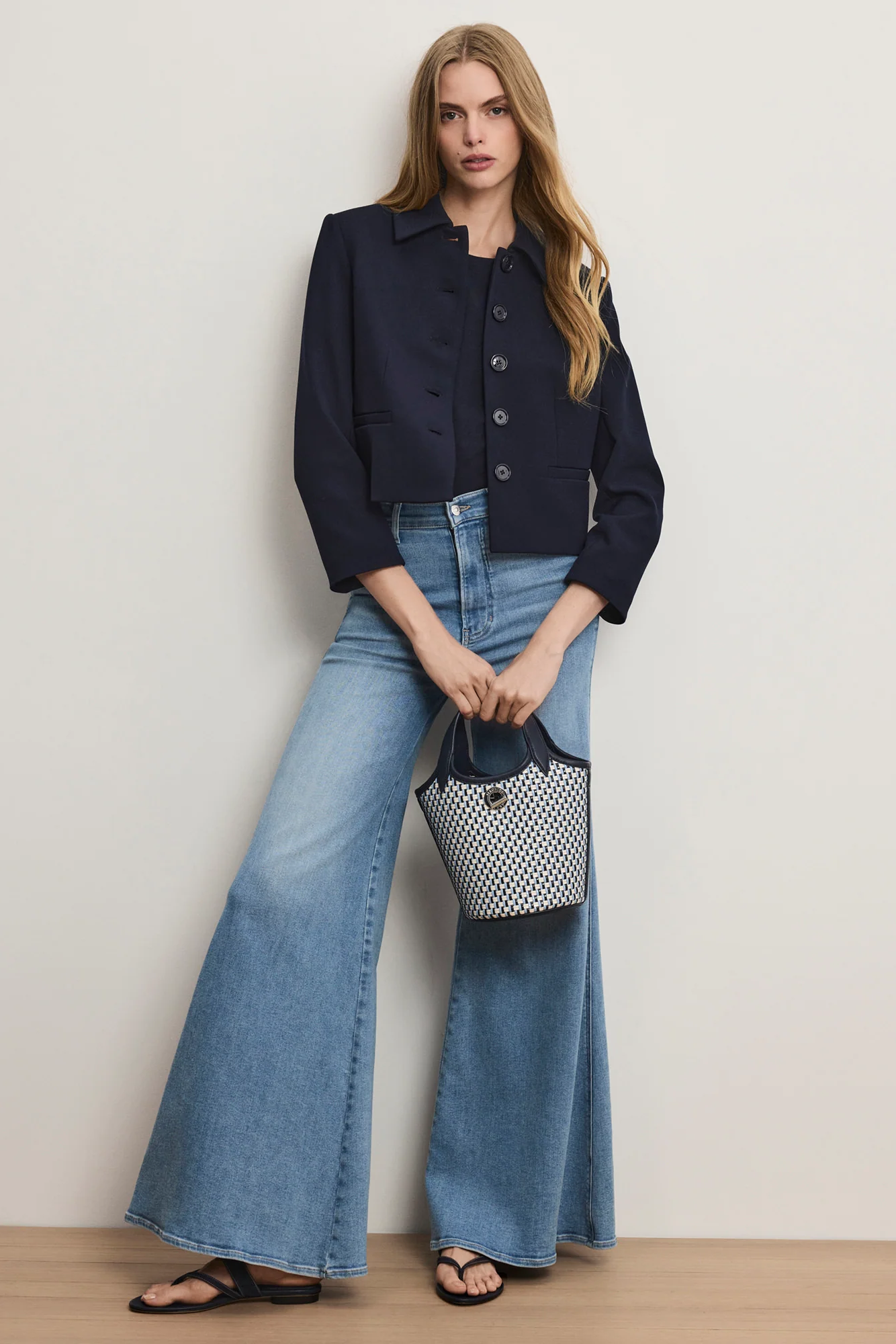 Crafted from a bestselling Transitional Suiting fabric, the Ismena navy jacket combines structure with comfortable stretch. Featuring a removable custom-printed foulard scarf tie and matching removable peekaboo cuffs, it offers versatile styling options. Designed with a cropped, single-breasted silhouette, it’s finished with a classic point collar and welt pockets. Easily dressed up or down, pair it with trousers or denim.