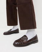 Penny loafer in woven espresso brown Italian leather. Features a padded leather footbed with gold stamped logo, a round toe, and a slip-on design. 0.75-inch heel.