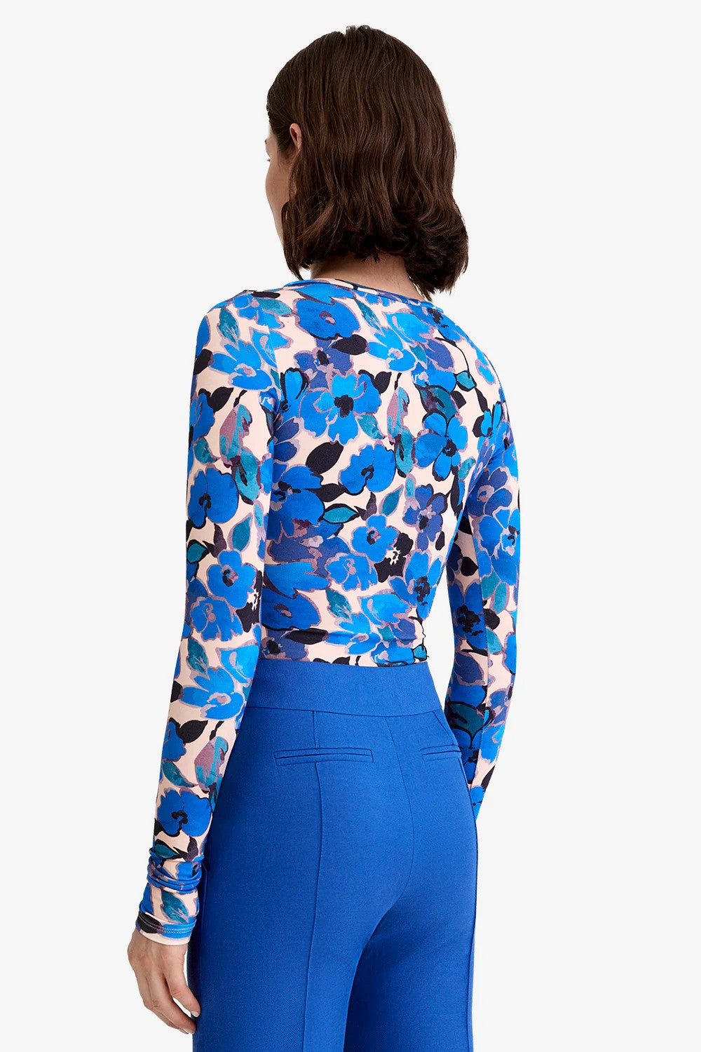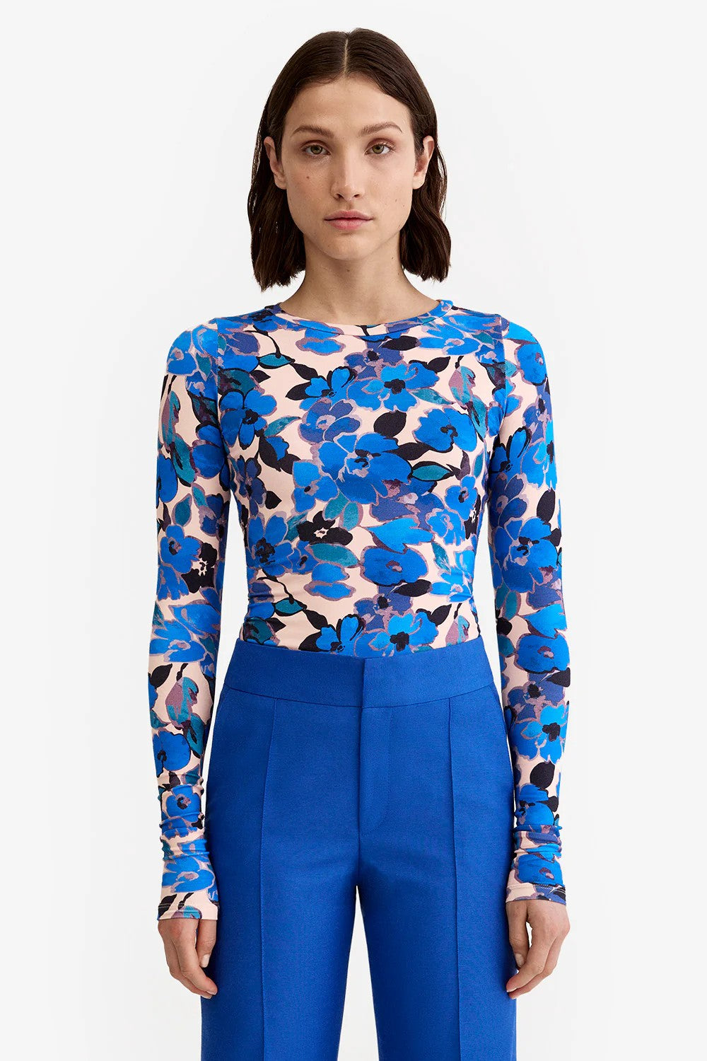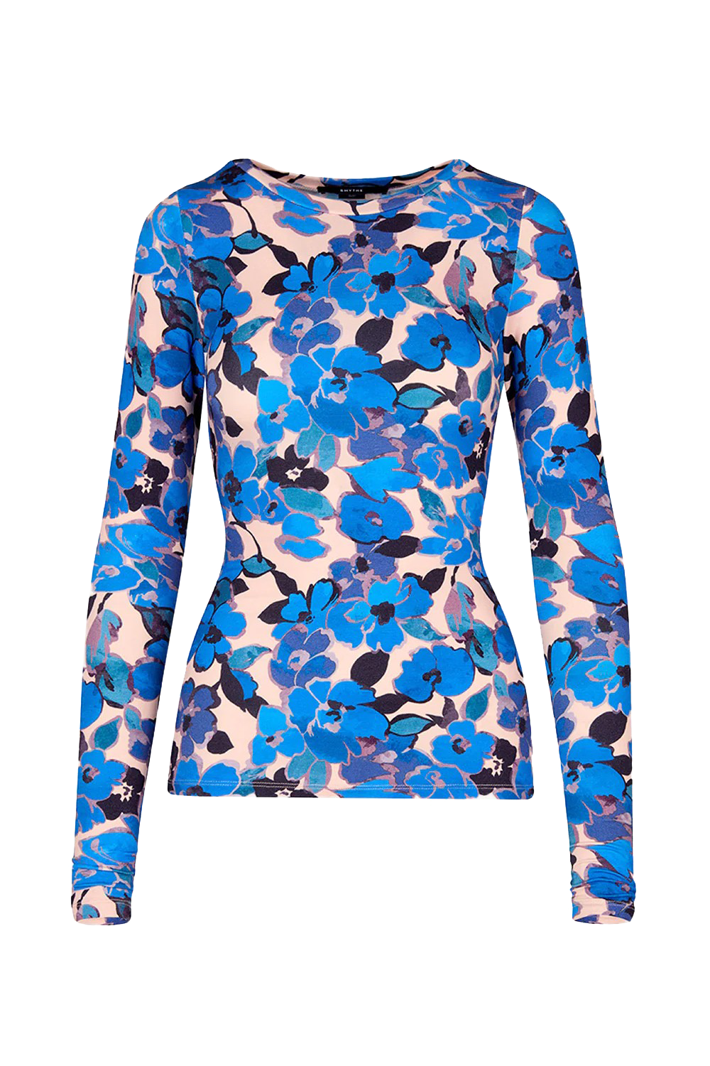 A stretch fitted knit top in a blush-grounded print. This classic crewneck features extra-long sleeves good for scrunching. This garment fits true to size, take your usual size.