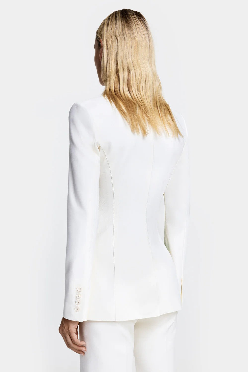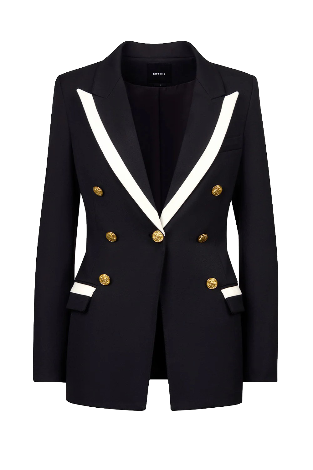 Decidedly tailored, this stretch longline silhouette has a peaked lapel and double-breasted button placements but is actually a single-breasted blazer in disguise.