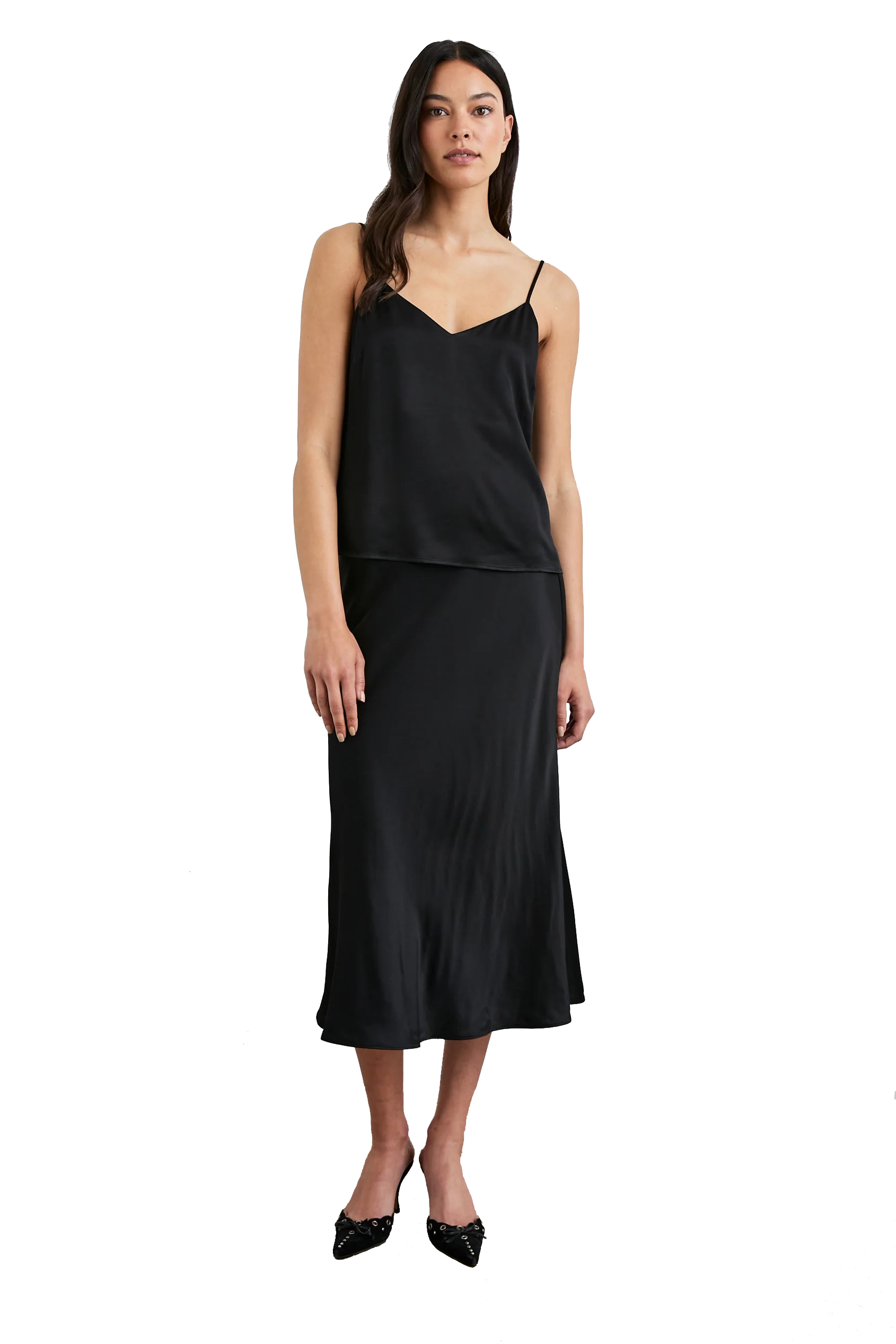 The Anya is a midi-length skirt with a concealed elastic waistband and satin crepe fabrication. Its high-waisted, pull-on design allows for effortless styling.