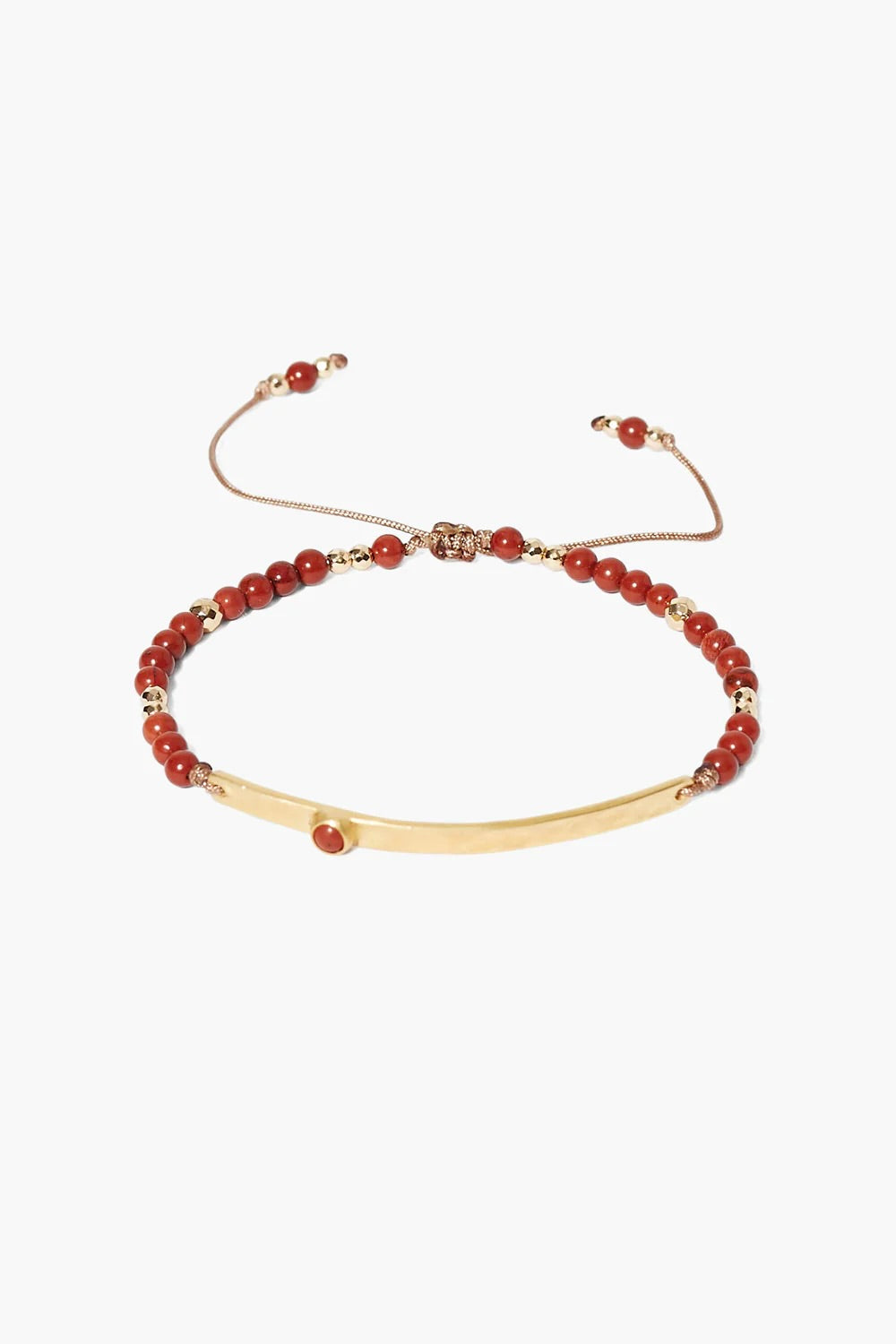 Beaded pull-tie bracelet featuring red jasper, gold beads, and a gold bar pendant.