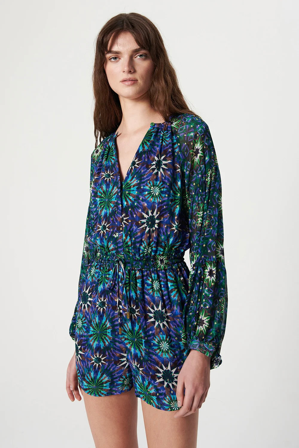 Why wear one print when you can wear two? Cut from georgette with lurex, the Rain Playsuit features Chufy's contrasting infinite Fractal prints on the body and sleeves. It has a round collar with a button and small slit, and fabric buttons down the front. The Rain Playsuit has long, wide sleeves that fasten with a button on the cuffs; side pockets; an adjustable drawstring waist; and soft crepe georgette lining. Style with our Indigo Embroidered Jacket and ankle boots.