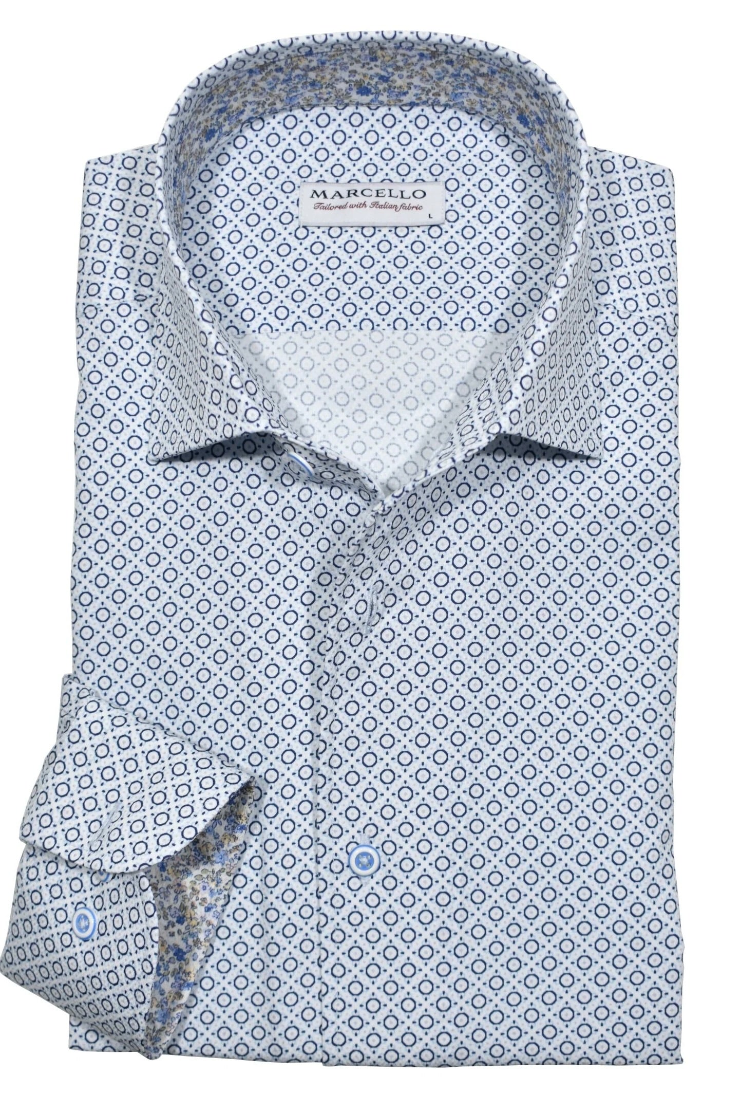 Marcello's circle medallion shirt is the perfect addition to your wardrobe. This classic circle medallion in warm navy on a white cotton fabric ground is both stylish and versatile. With soft accents of sky blue and the Marcello one piece roll collar, this top is sure to stand out and look fantastic all the time.