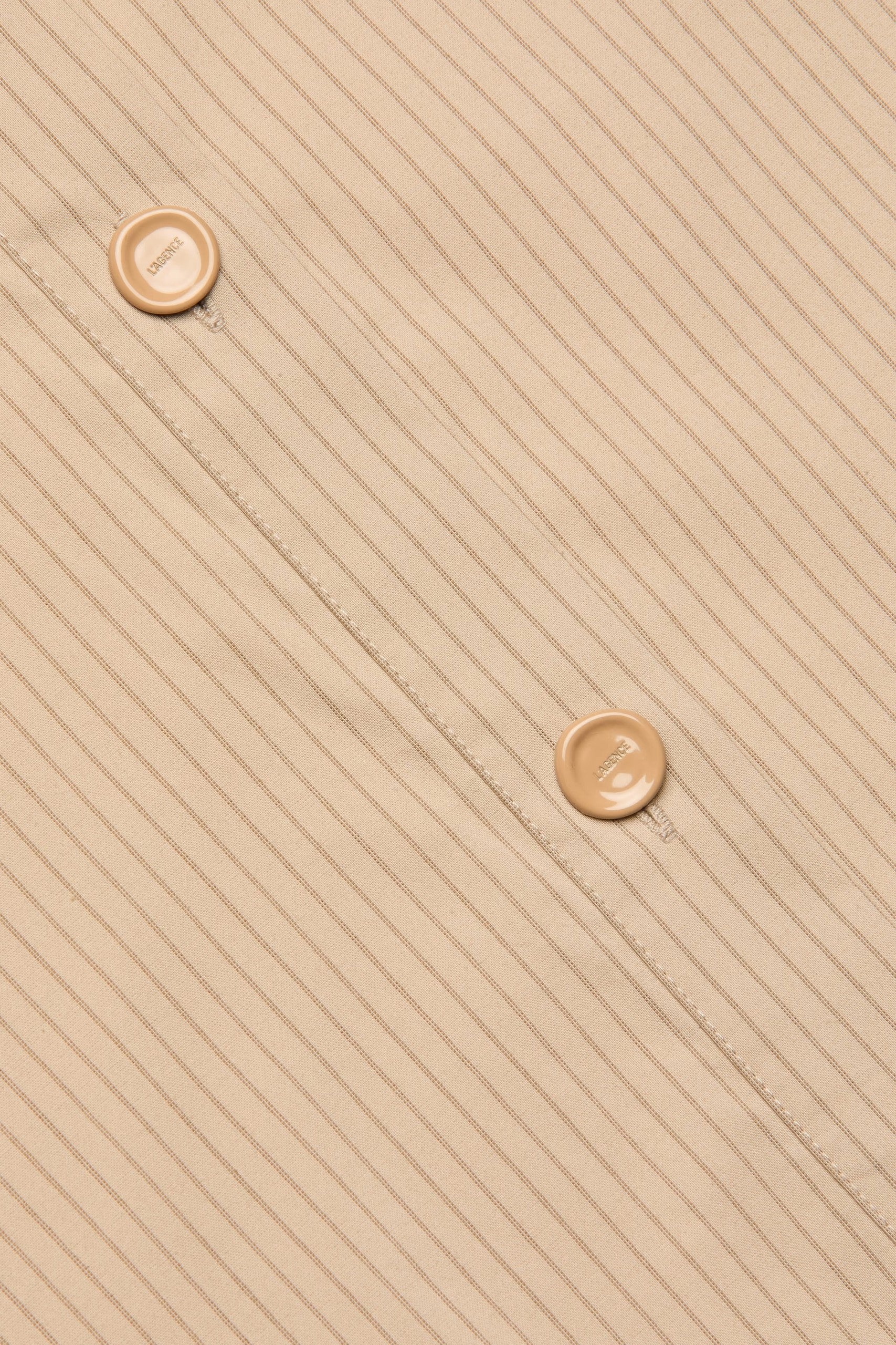 A classic tailored shirt with a cool, borrowed-from-the-boys fit and cropped high-low hem. Now back in neutral tan with a subtle pinstripe.