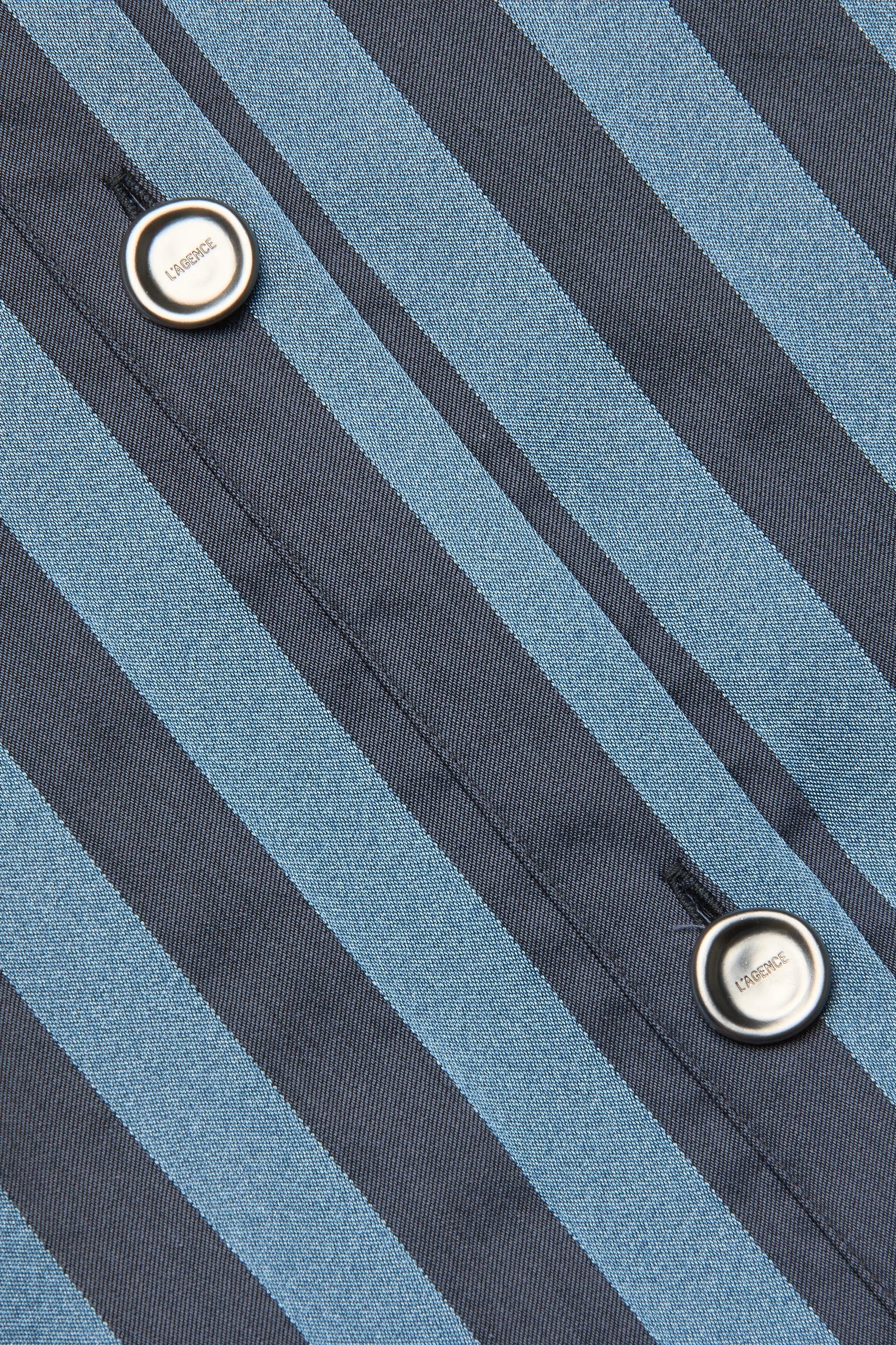 A classic tailored shirt with a cool, borrowed-from-the-boys fit and cropped high-low hem. Now back in a blue striped satin.
