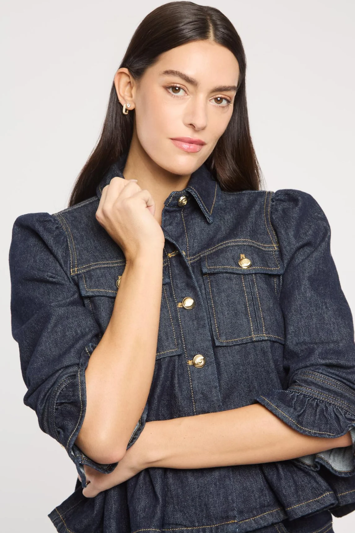 The Delanie Jean Jacket reimagines denim sophistication with its distinctive peplum hems and rich dark Indigo Noir fabric. Golden buttons accent the front pockets and closure, adding a touch of refined glamour to this elevated essential. A versatile piece that effortlessly bridges casual and polished aesthetics.