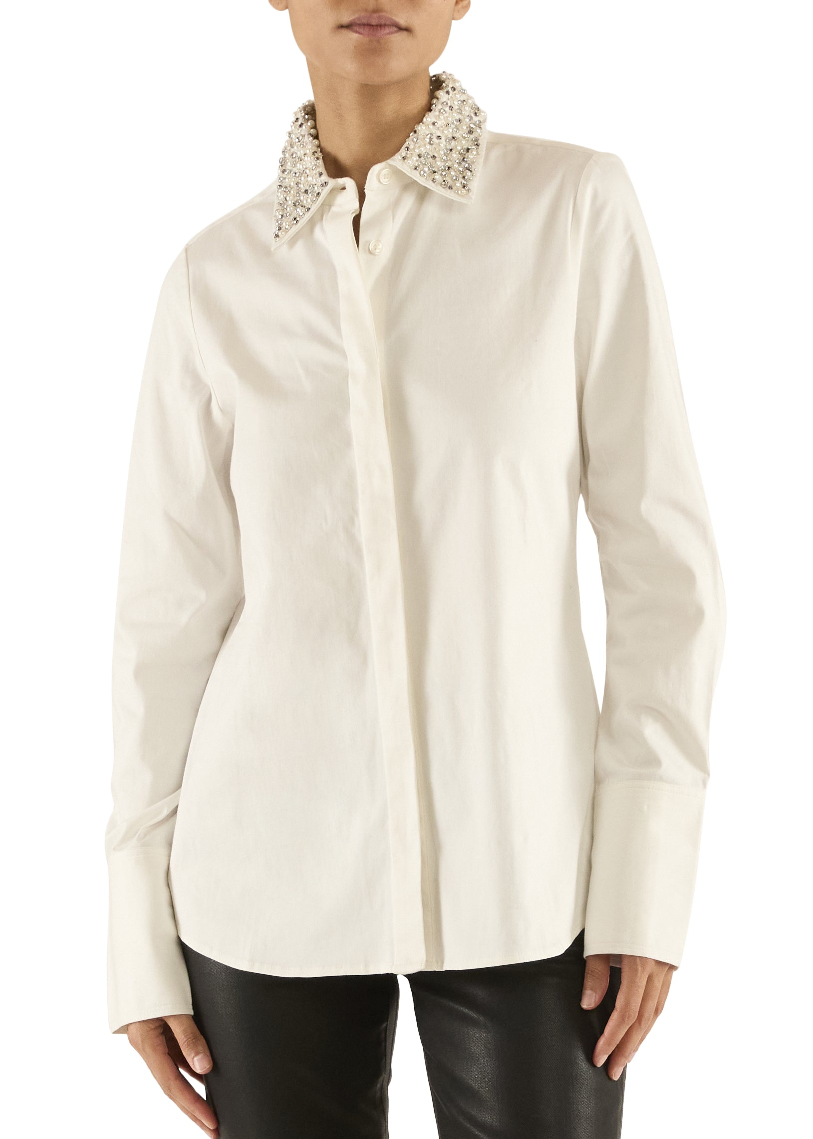 This is a classic long-sleeve white button-down shirt elevated with a statement embellished collar.