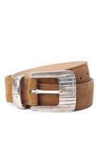 Subtle Western-inspired engravings on a solid brass buckle add dimension to this classic suede belt.