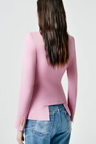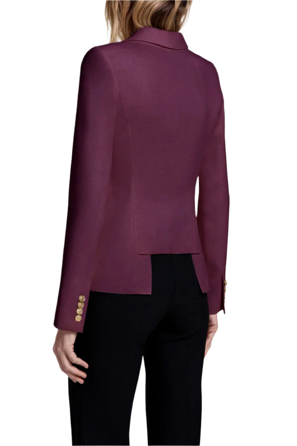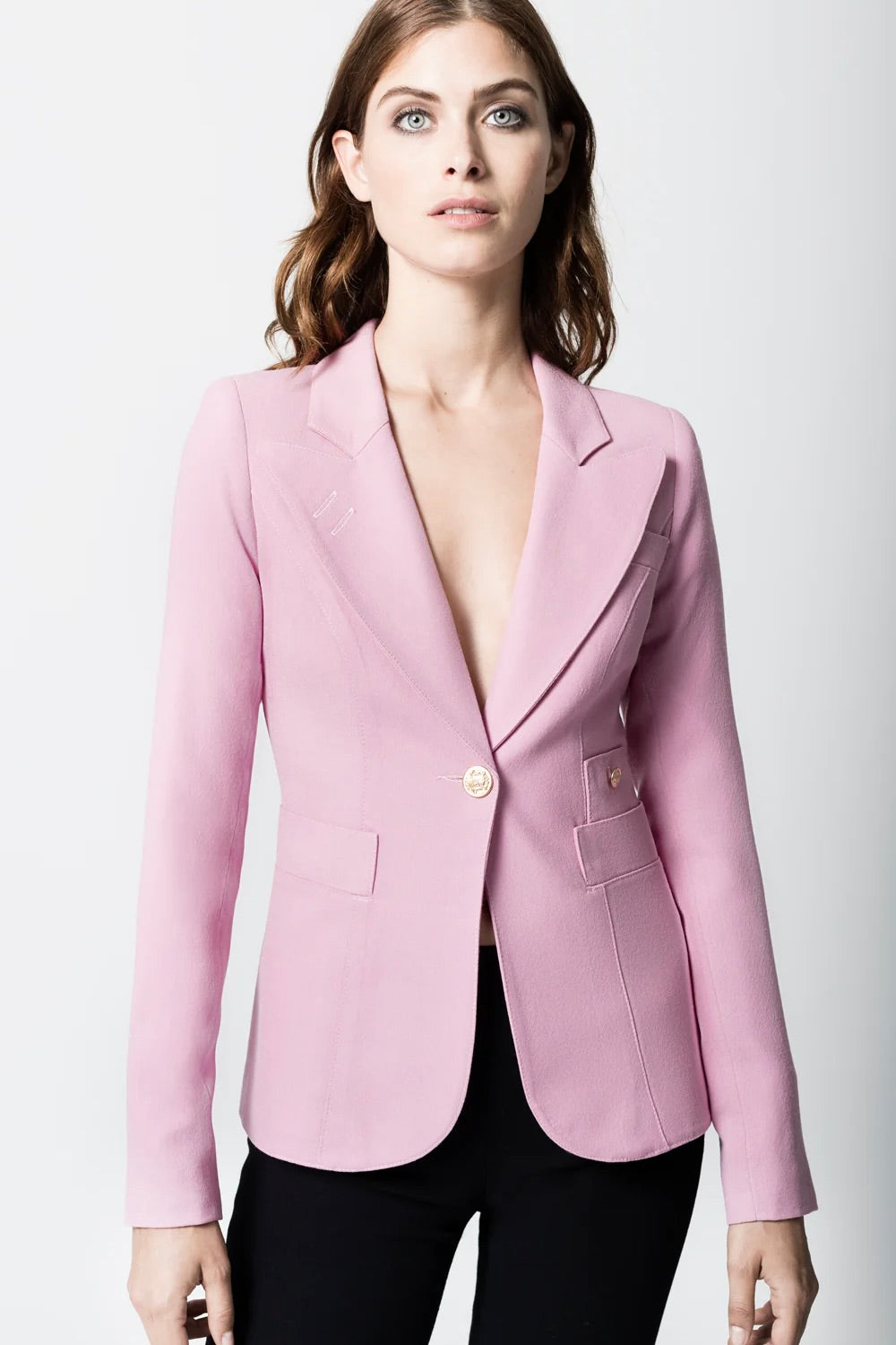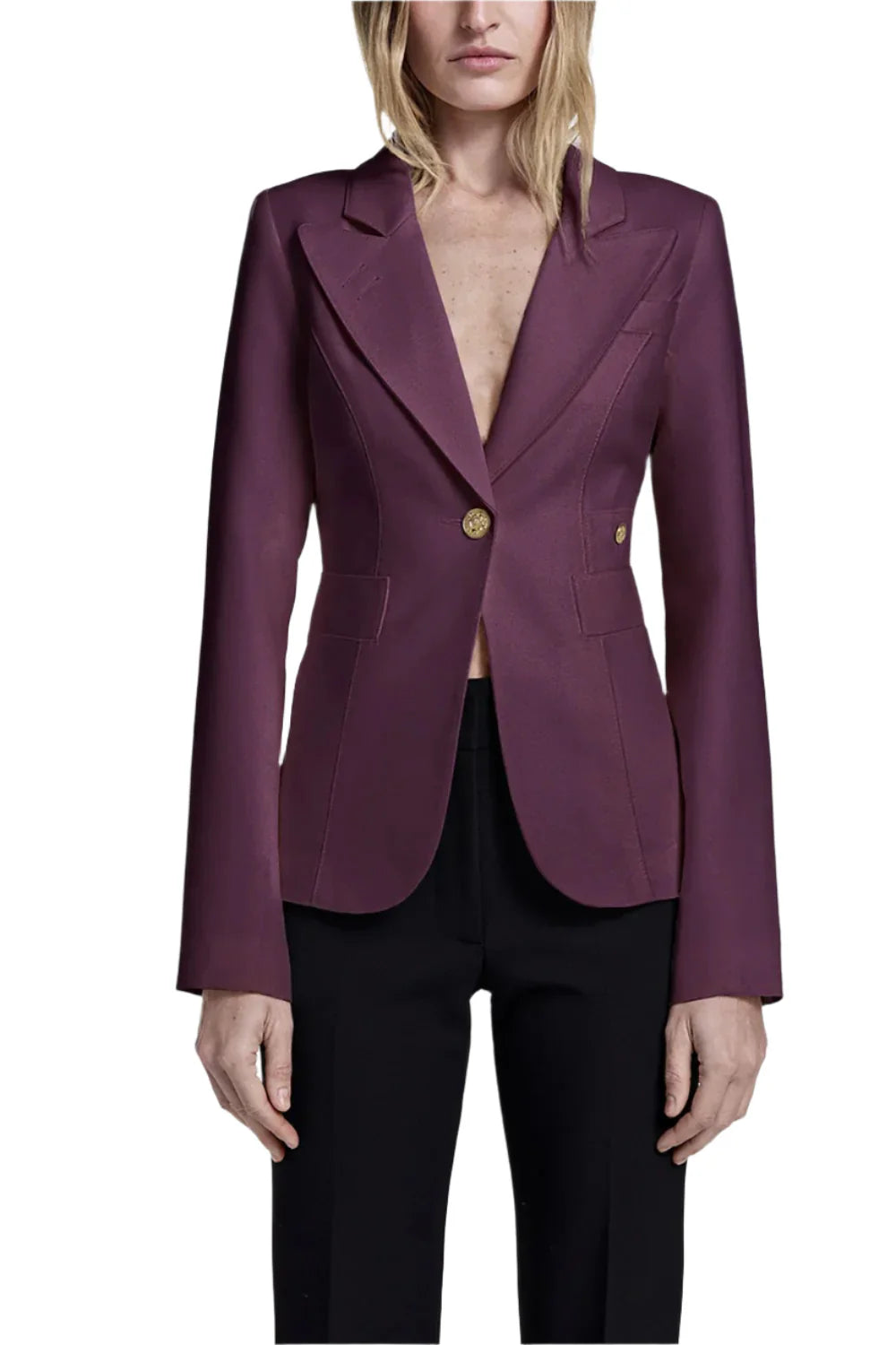 Decidedly tailored and one of our top selling silhouettes, this single-breasted blazer features a “cheeky” cut out back vent and brass hardware. Curvy figures may wish to go up a size.