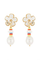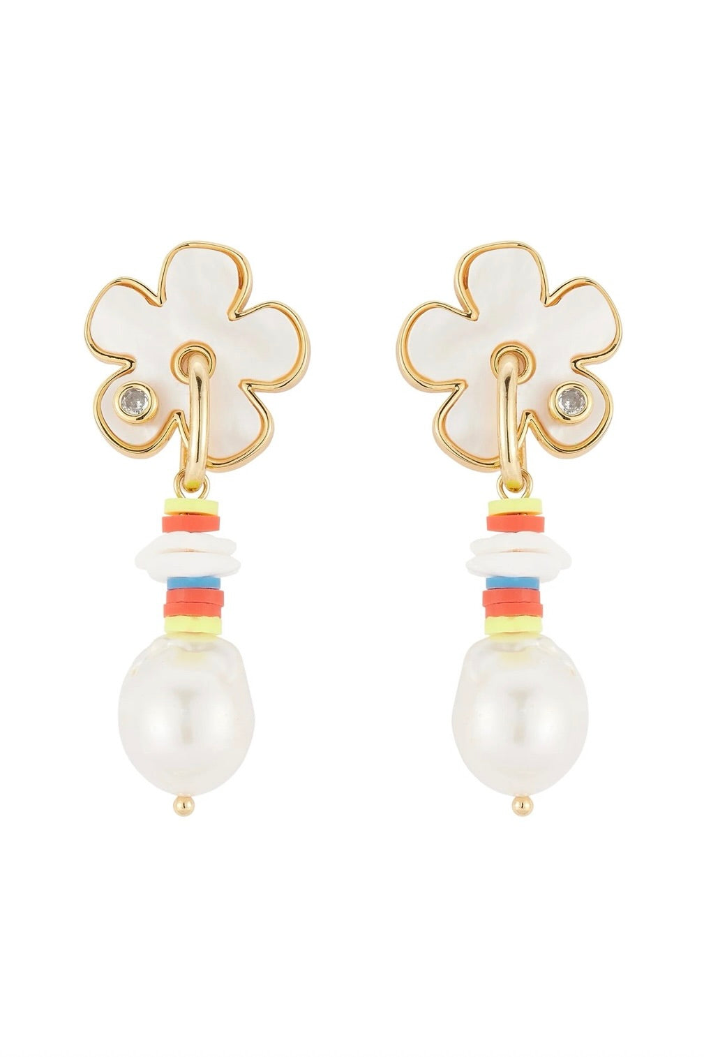 The Romy Drop Earrings are inspired by the lively energy of the Summer season. Featuring a mother of pear flower stud, with a stack of colorful beads and a natural pearl drop below.