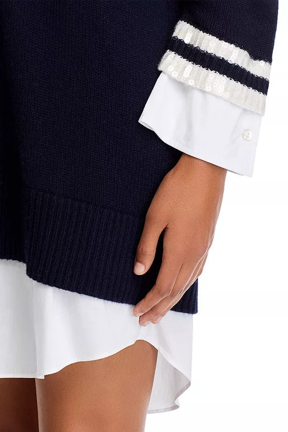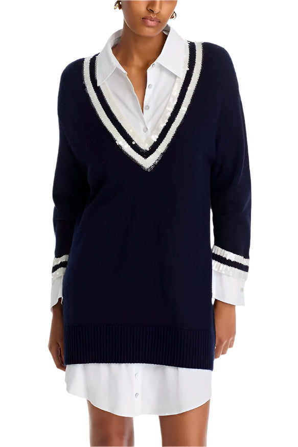 This layered sweater dress features a classic V-neck knit with contrast trim over a crisp white shirtdress silhouette. Polished yet effortless, it’s an easy one-and-done look that works from day to dinner.