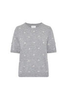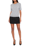 This cozy, short sleeved knit is embellished with sparkly rhinestones that are even placed throughout. It’s trimmed with ribbing detail along the neckline, hemline, and each sleeve.