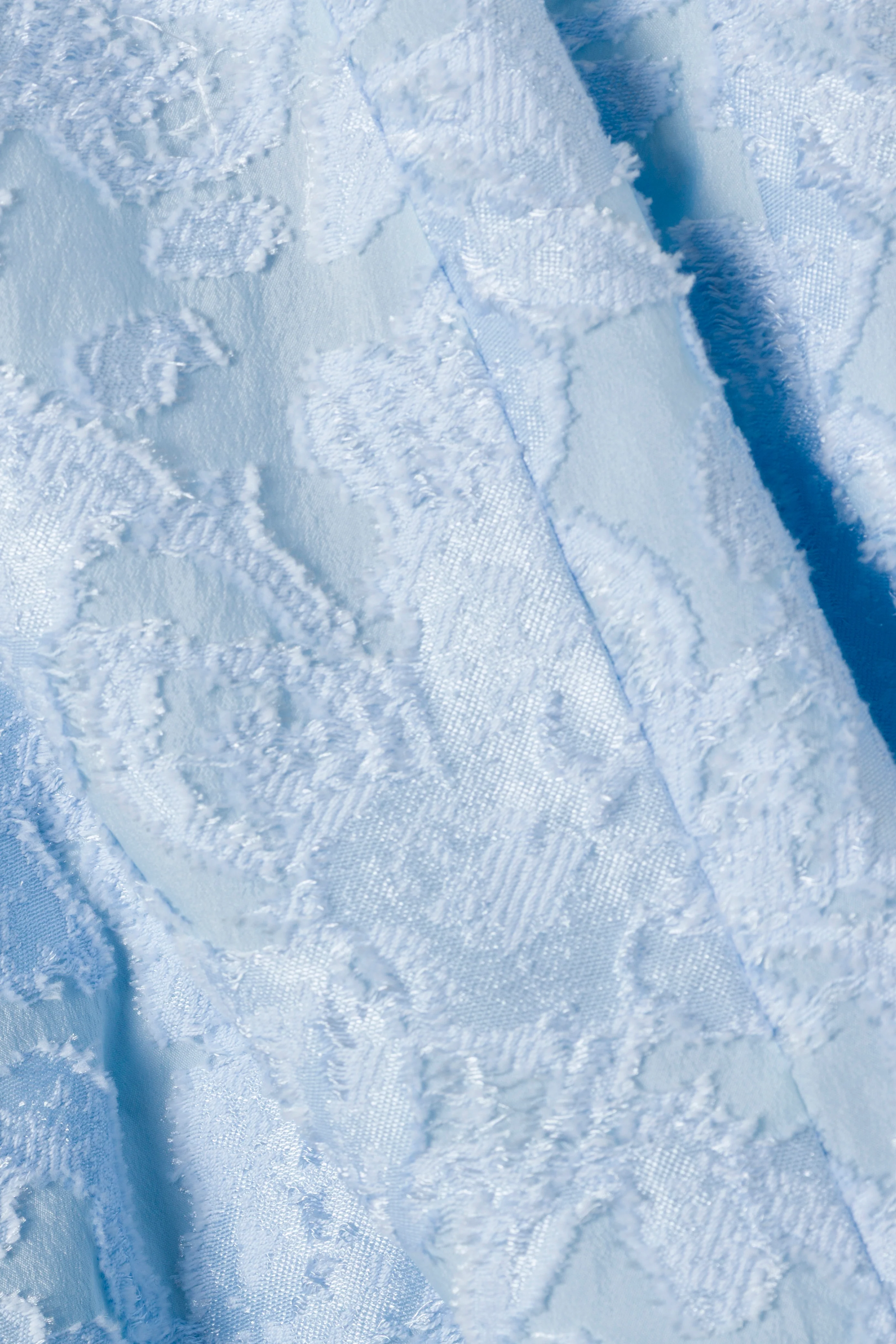 The Valeria Jacquard Midi Dress in Tidepool. This strapless dress features an exquisite sheer organza jacquard, creating a striking blend of texture and pattern. Its sculpted silhouette and detailed craftsmanship lend a timeless elegance and sophisticated appeal to the overall look.