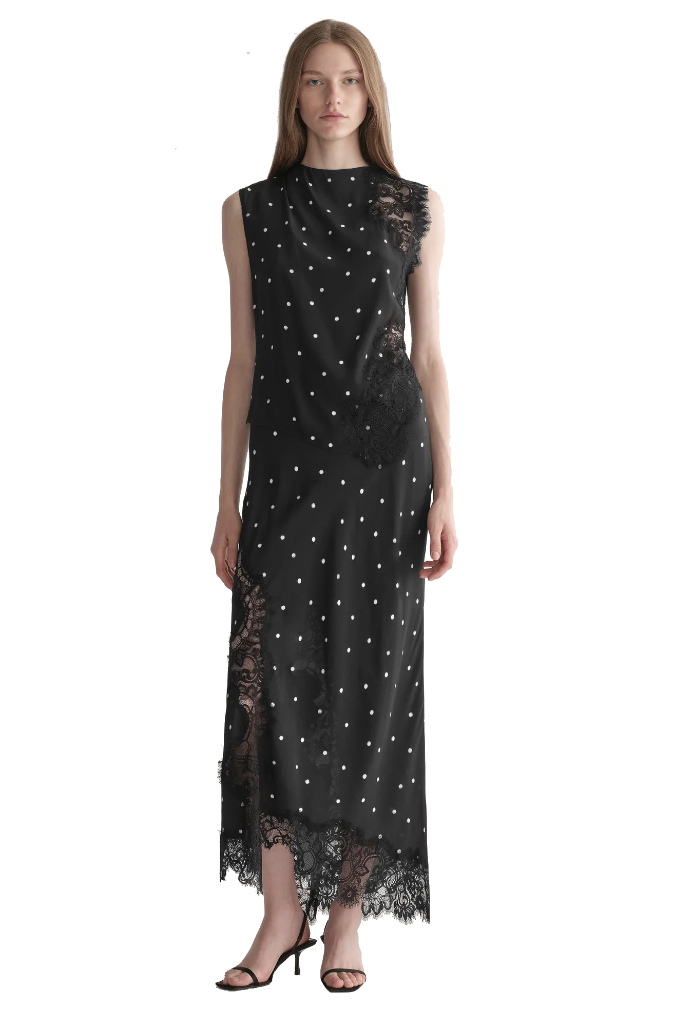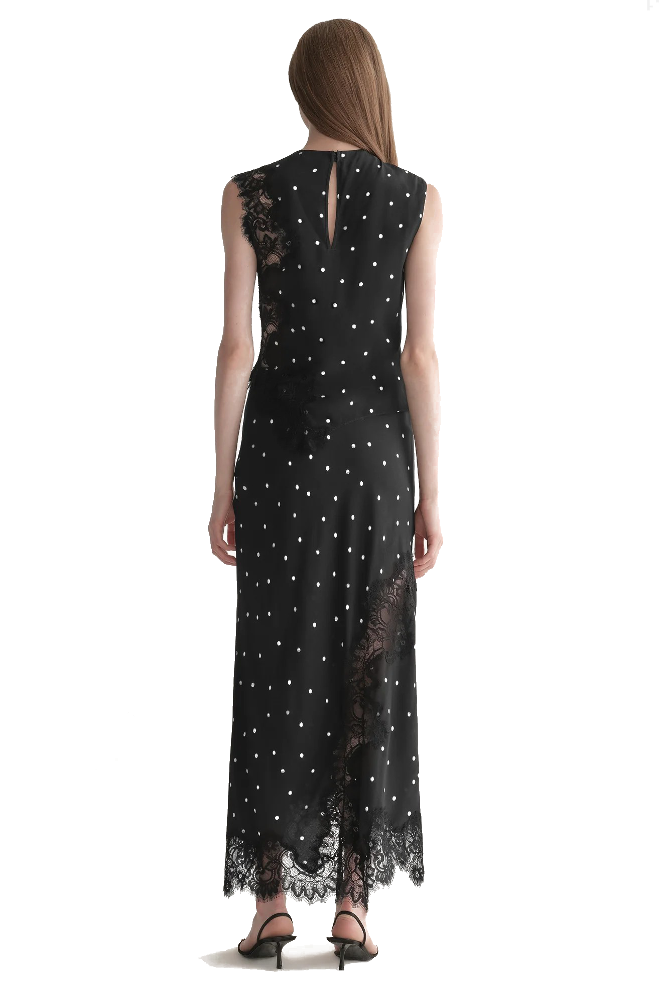 The Olivia Skirt is crafted from lightweight viscose with a soft drape and subtle sheen. Designed in a timeless polka-dot motif, this midi silhouette features asymmetric lace inserts that trail along the hemline, creating a play of texture and movement.