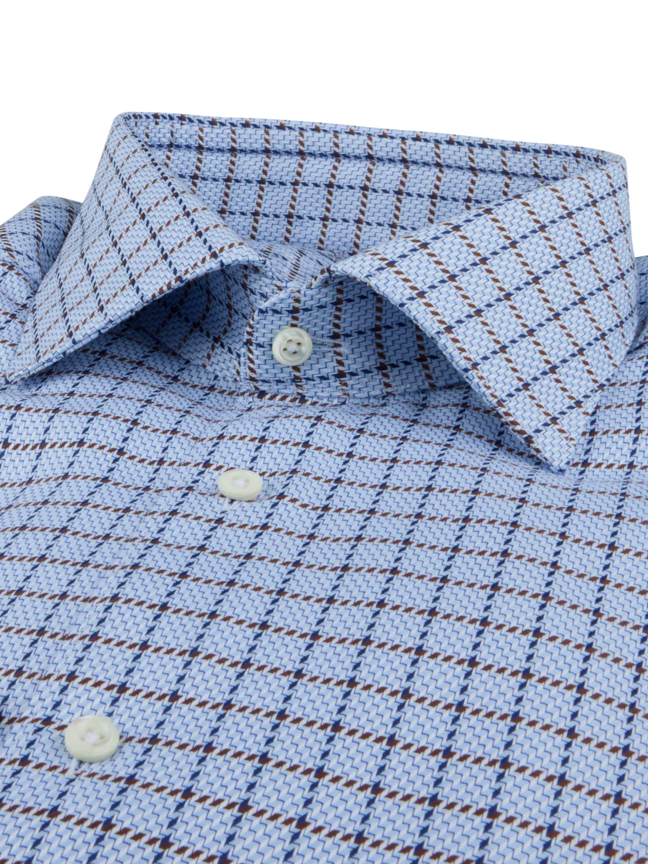 This checked twill shirt is made of twofold cotton. The shirt is detailed with mother of pearl buttons, single cuffs and a cut away collar.