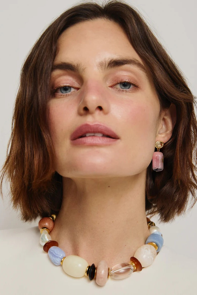 Observe the butterfly effect in a mixed-media collar necklace with the power to transform your wardrobe. With resin, freshwater pearl, angelite, rock crystal, carved chalcedony, peach calcite, and gold-plated beads, and cord toggle closure.