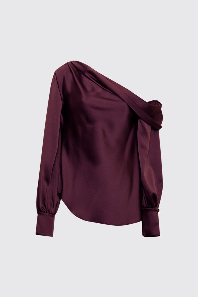 This one-shoulder piece features a dramatic drape with voluminous sleeves that cinch at the cuffs. The asymmetric neckline adds a bold, modern touch to its sophisticated design.