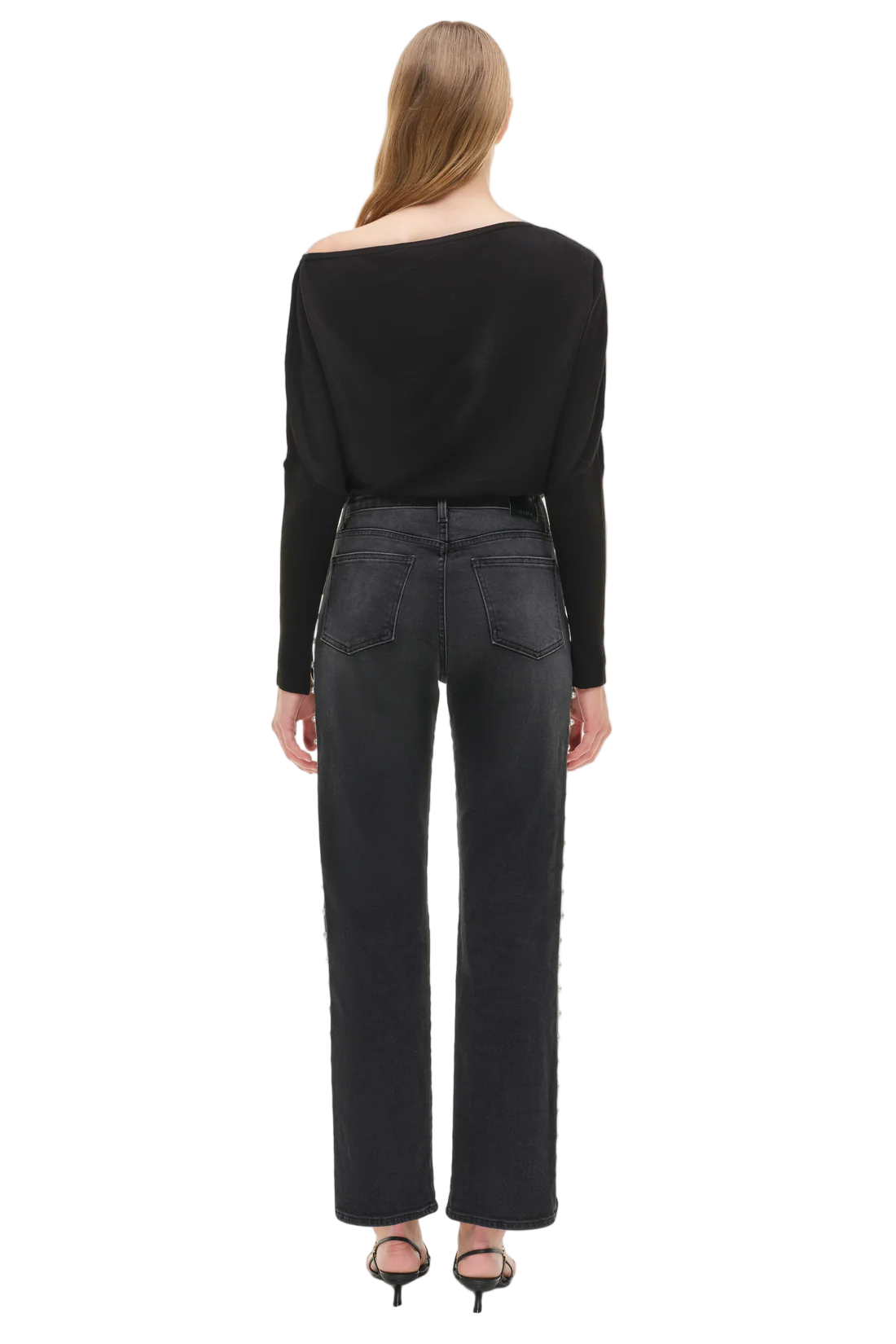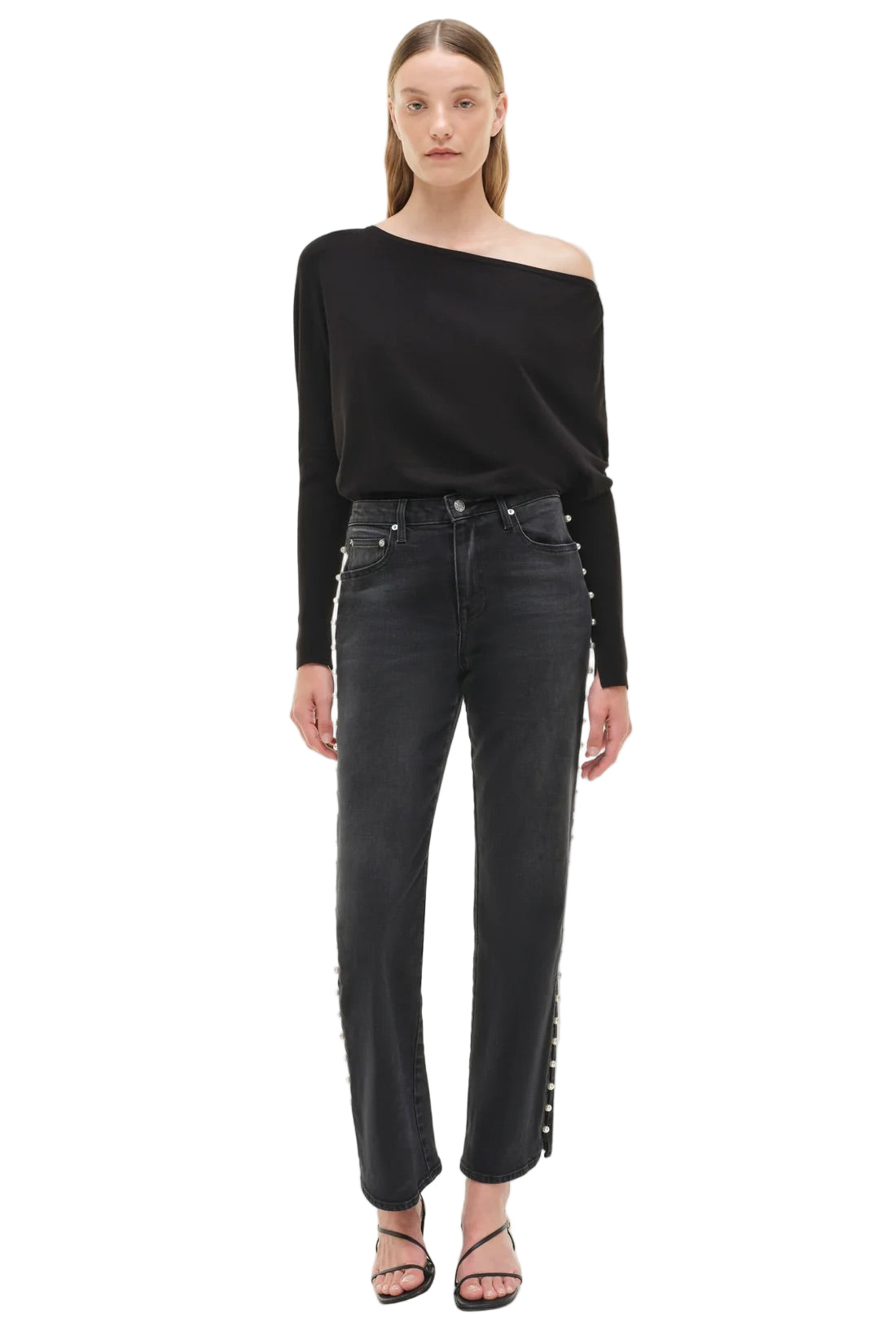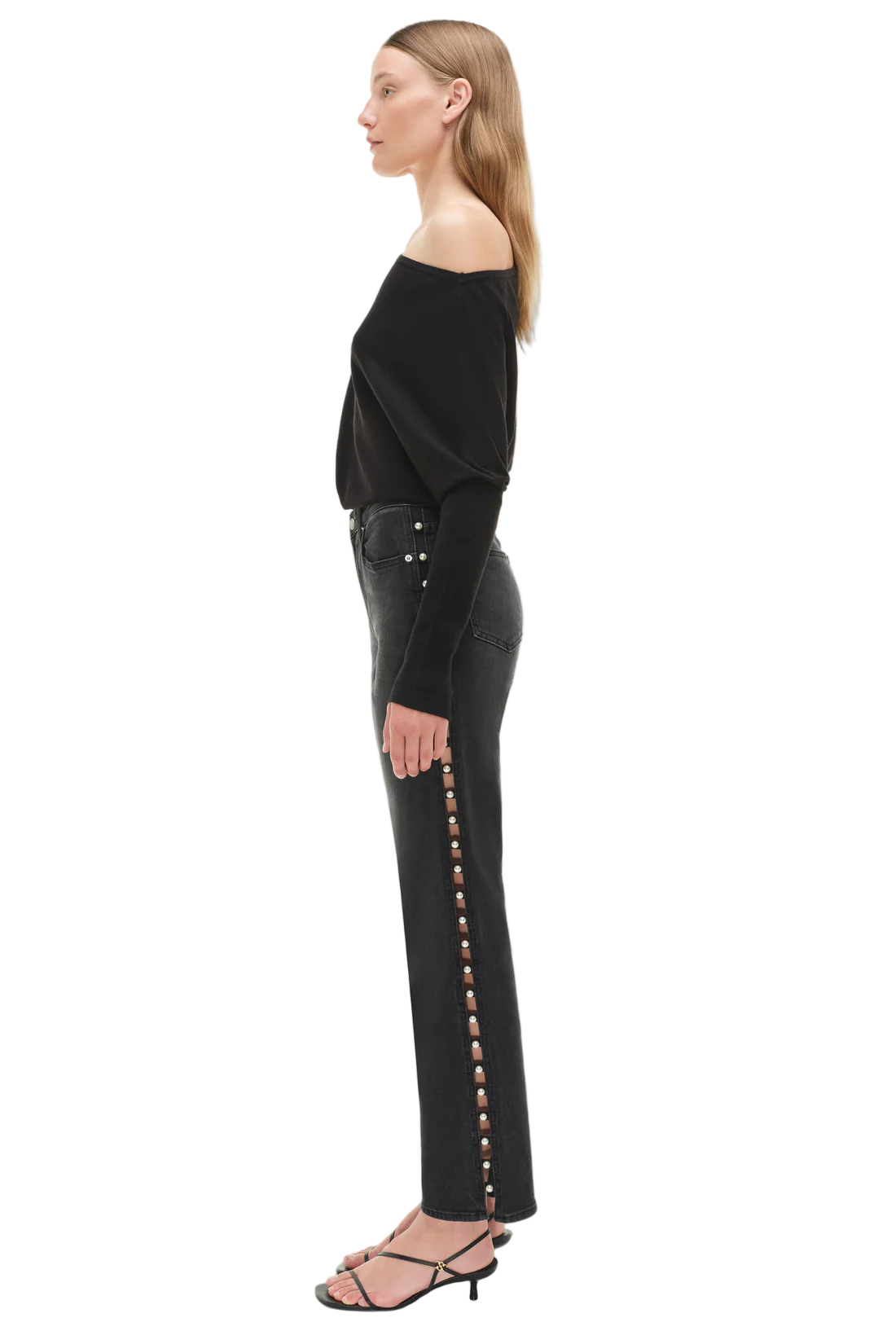 A straight leg jean in the classic 5 pocket contruction with pearl embellishments down the side.
