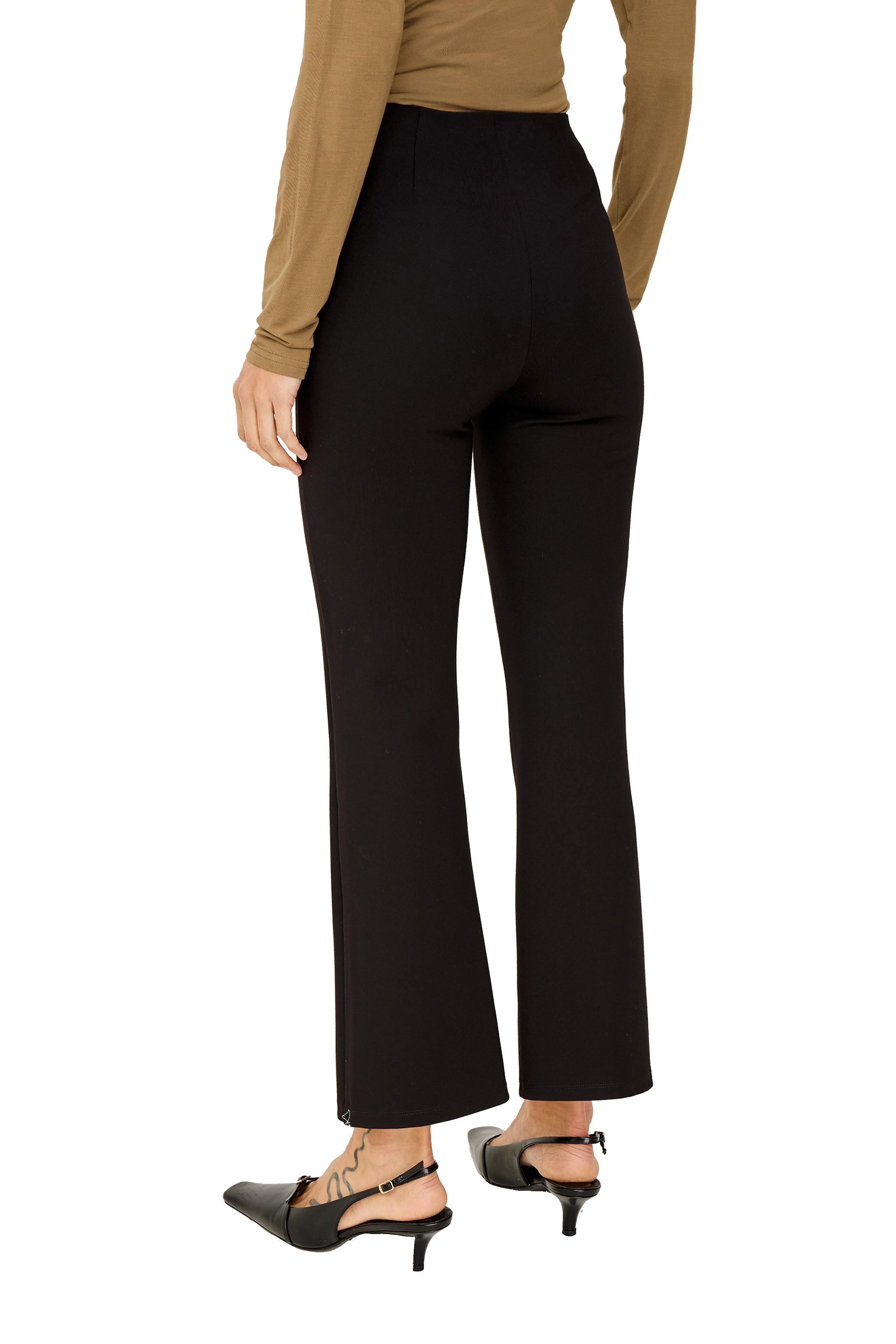 Ankle length black trousers with subtle bootcut silhouette