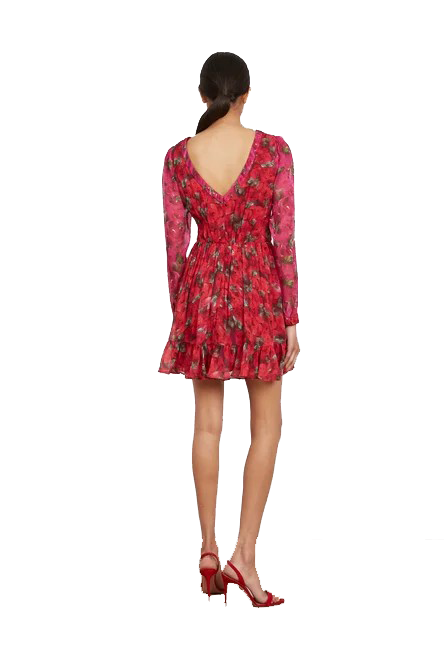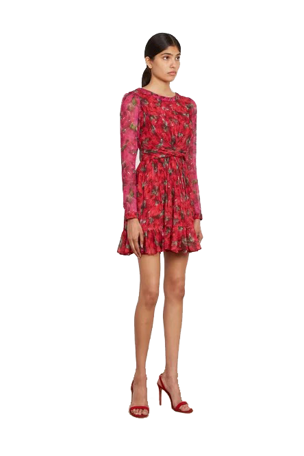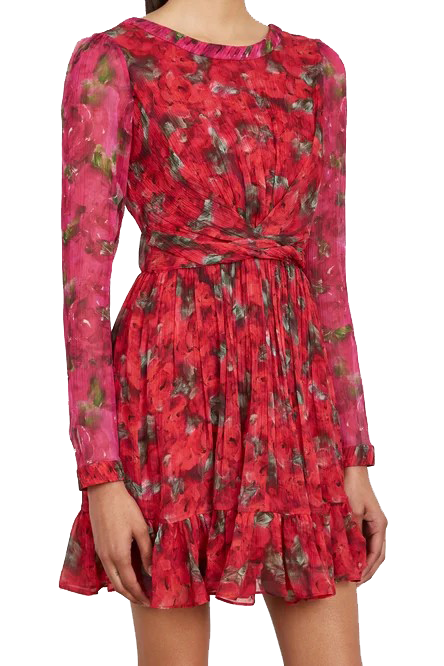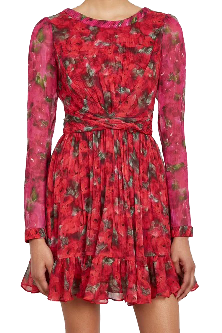 Long sleeved mini dress with a painterly print in magenta rosebud