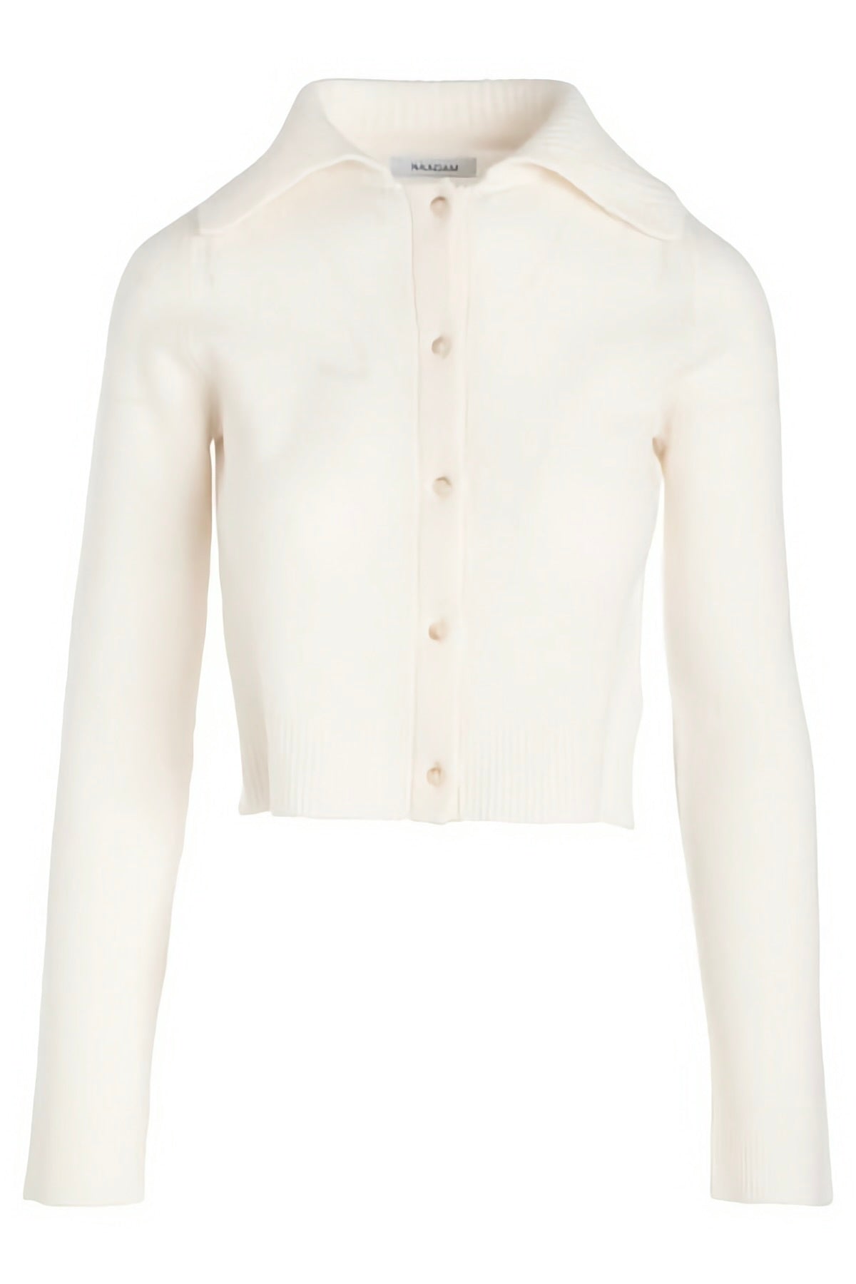 The Coastal Cashmere Collared Cardigan features button front, wide collar, and elongated sleeves.