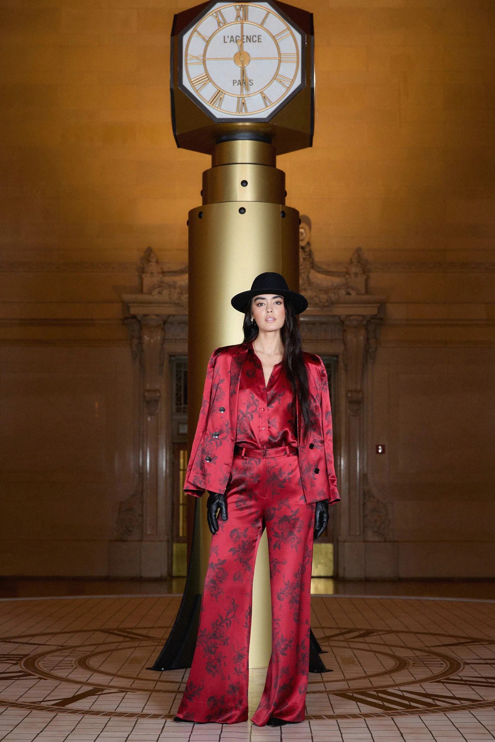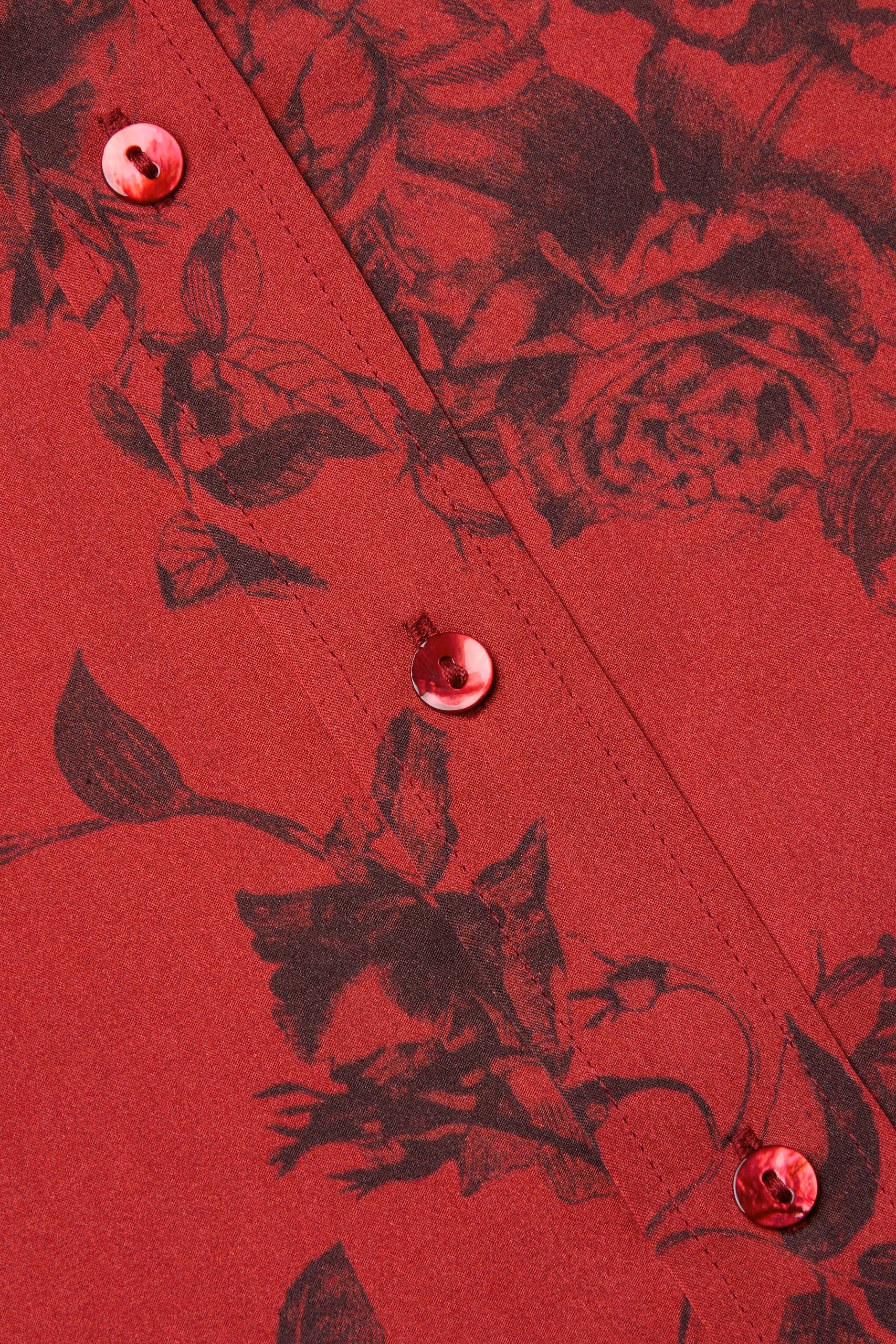 The Dani is the iconic silk button-down that belongs in every wardrobe. The signature three-quarter sleeve shirt is back in burgundy in an artistic floral print.