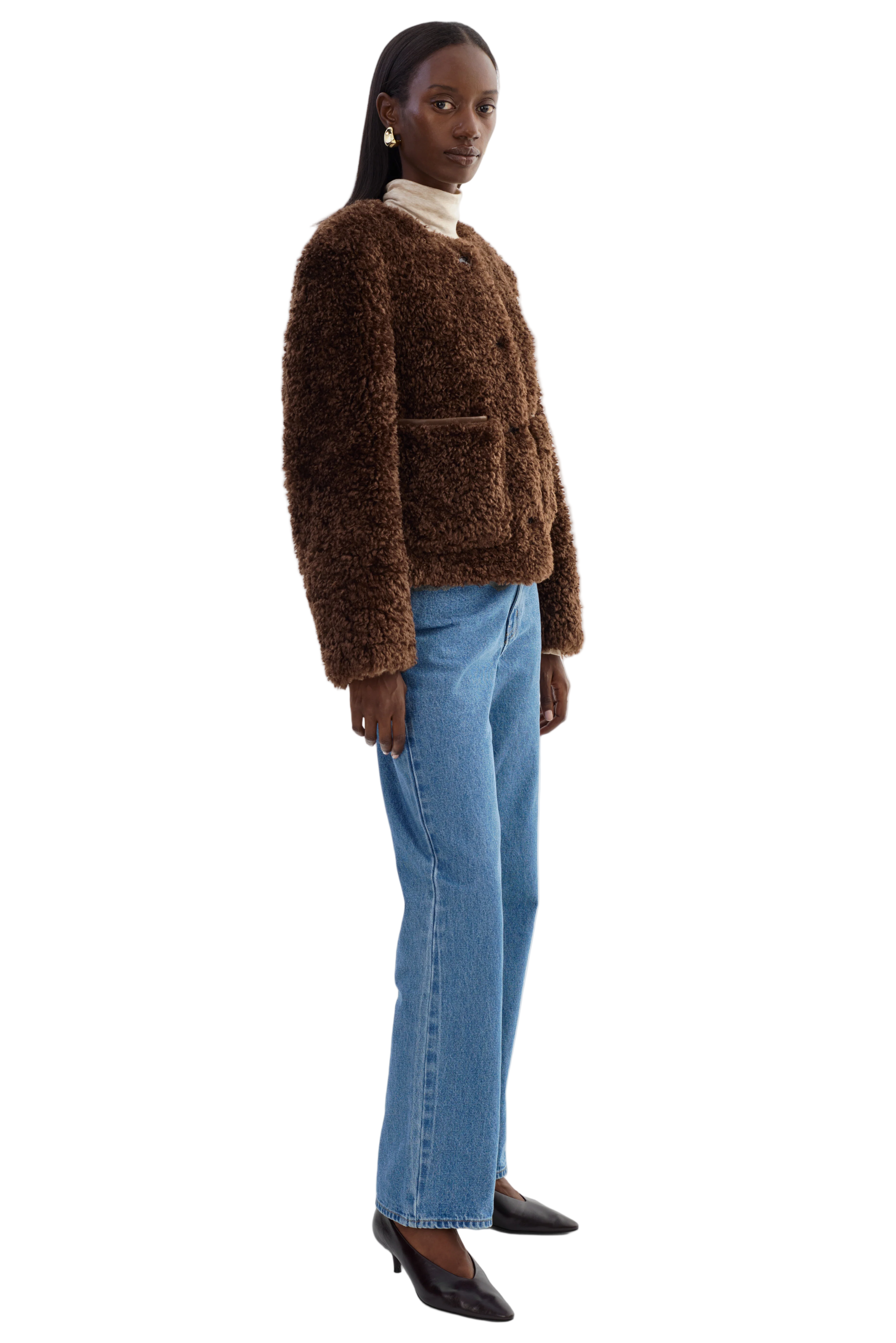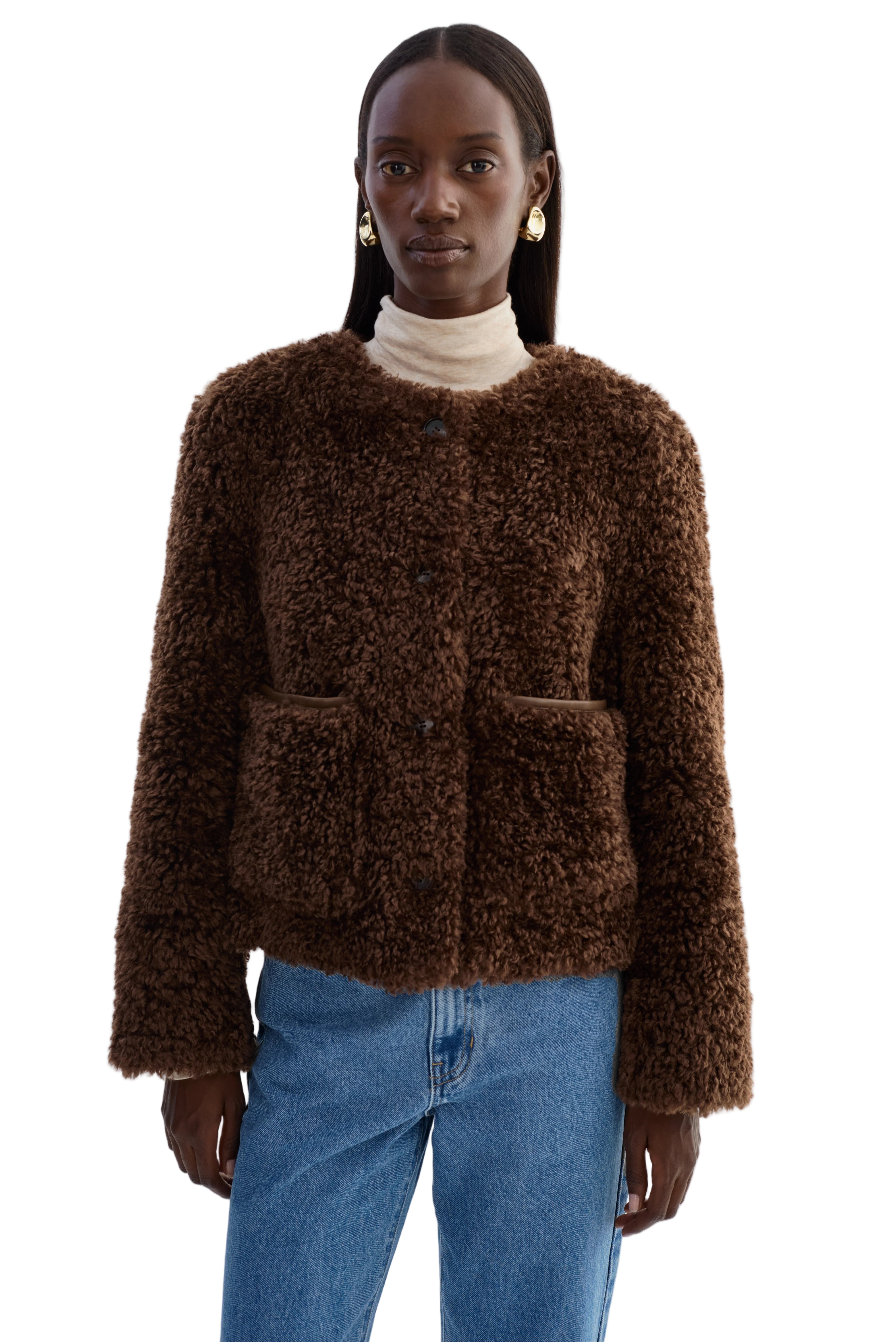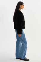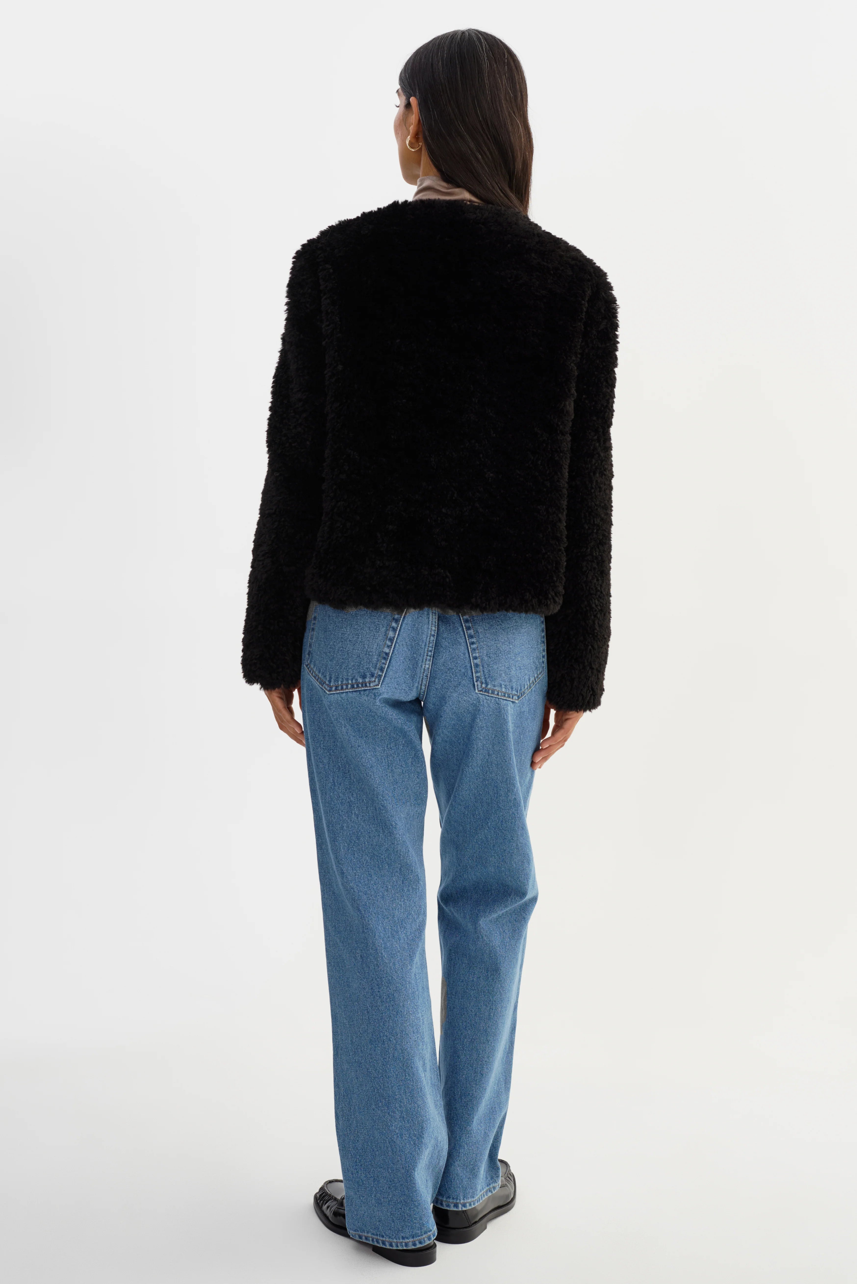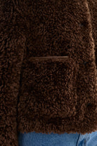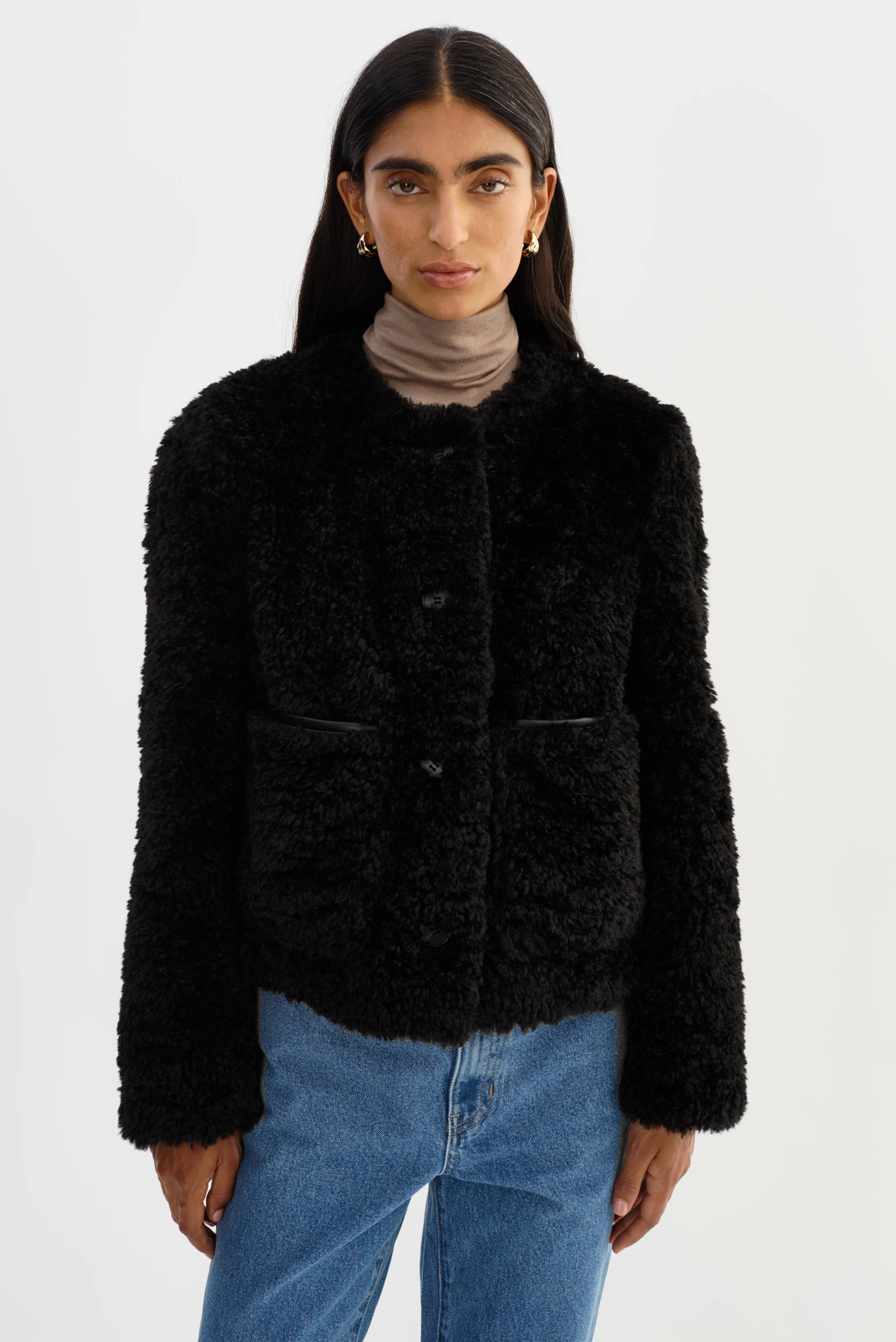 Effortlessly refined, the EMILIA Sherpa Jacket blends texture and polish for a modern take on cozy dressing. Crafted from soft curly sherpa, it features a rounded neckline, tonal button closure, and subtle front pockets for a polished yet plush finish. The cropped length makes it perfect for balancing proportions, whether styled with denim or elevated tailoring.