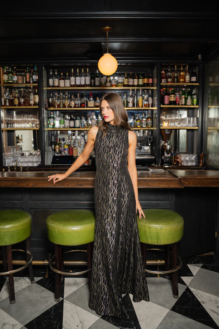 This stunning evening gown is made in a beautiful metallic chiffon fabric. The neckline has draping with a back sash detail, and the body is sleek and clean. The bodice is fitted and the skirt flares out around the knee area. Fully lined with a center back invisible zip closure.