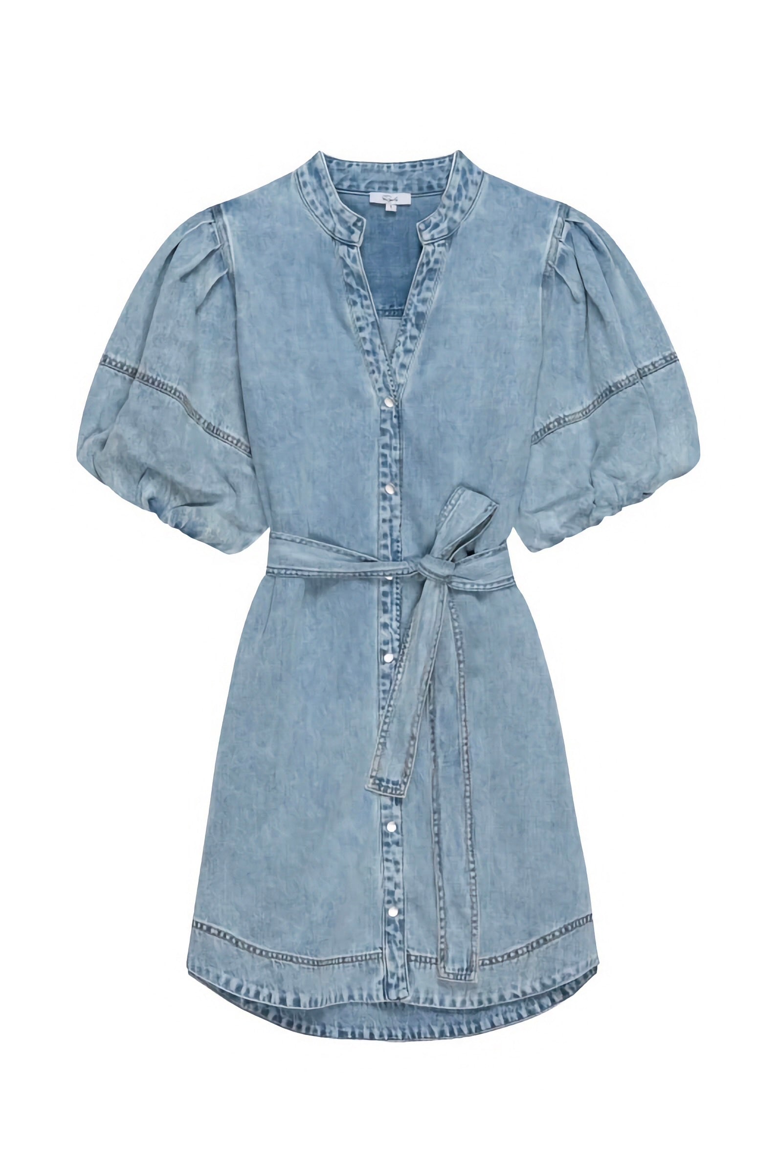 The Kingsley mini dress features pleated puff sleeves with a flattering curved hem. It's crafted from soft, supple denim and finished with center front snaps and a self-tie belt for an adjustable fit