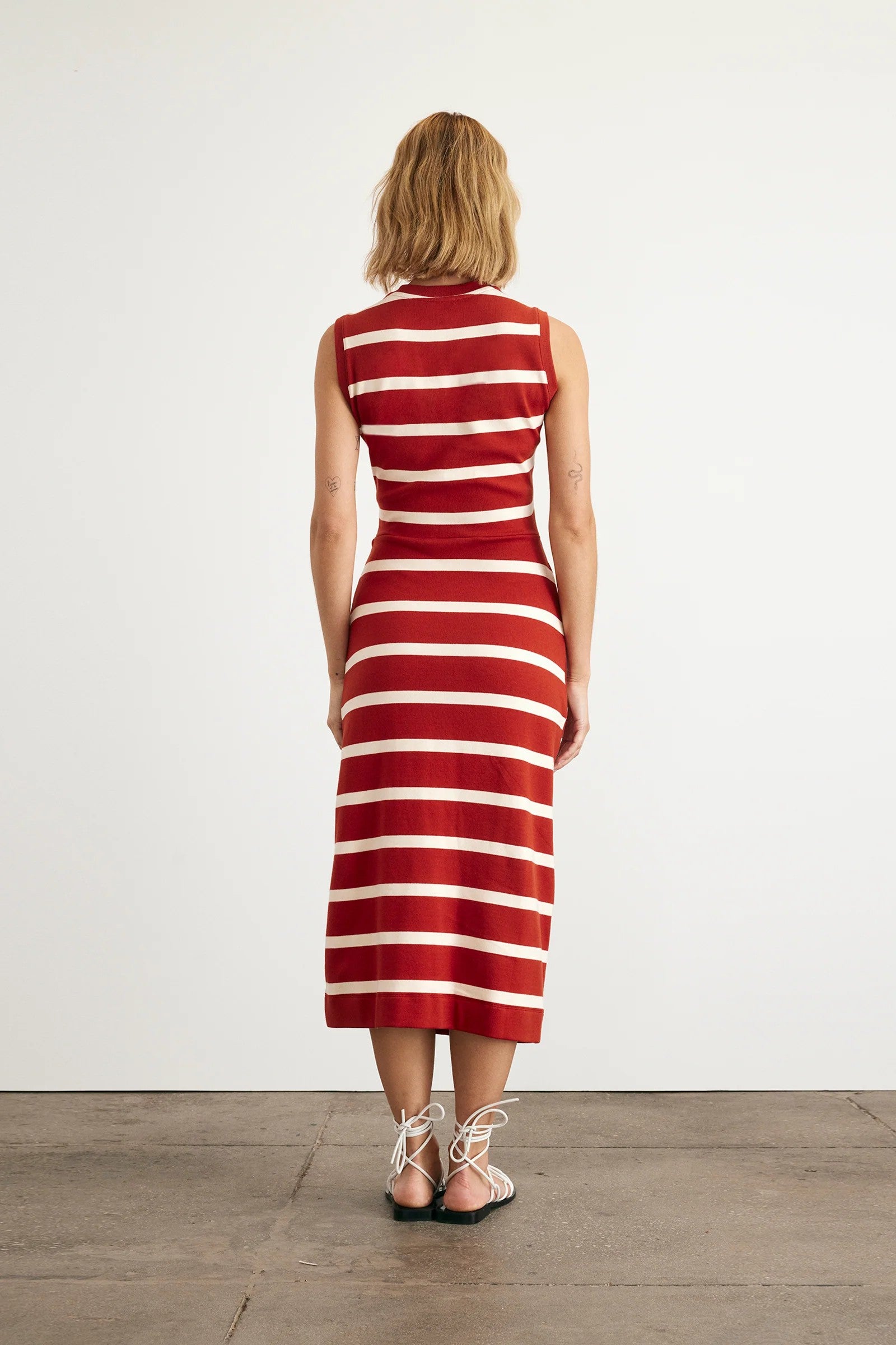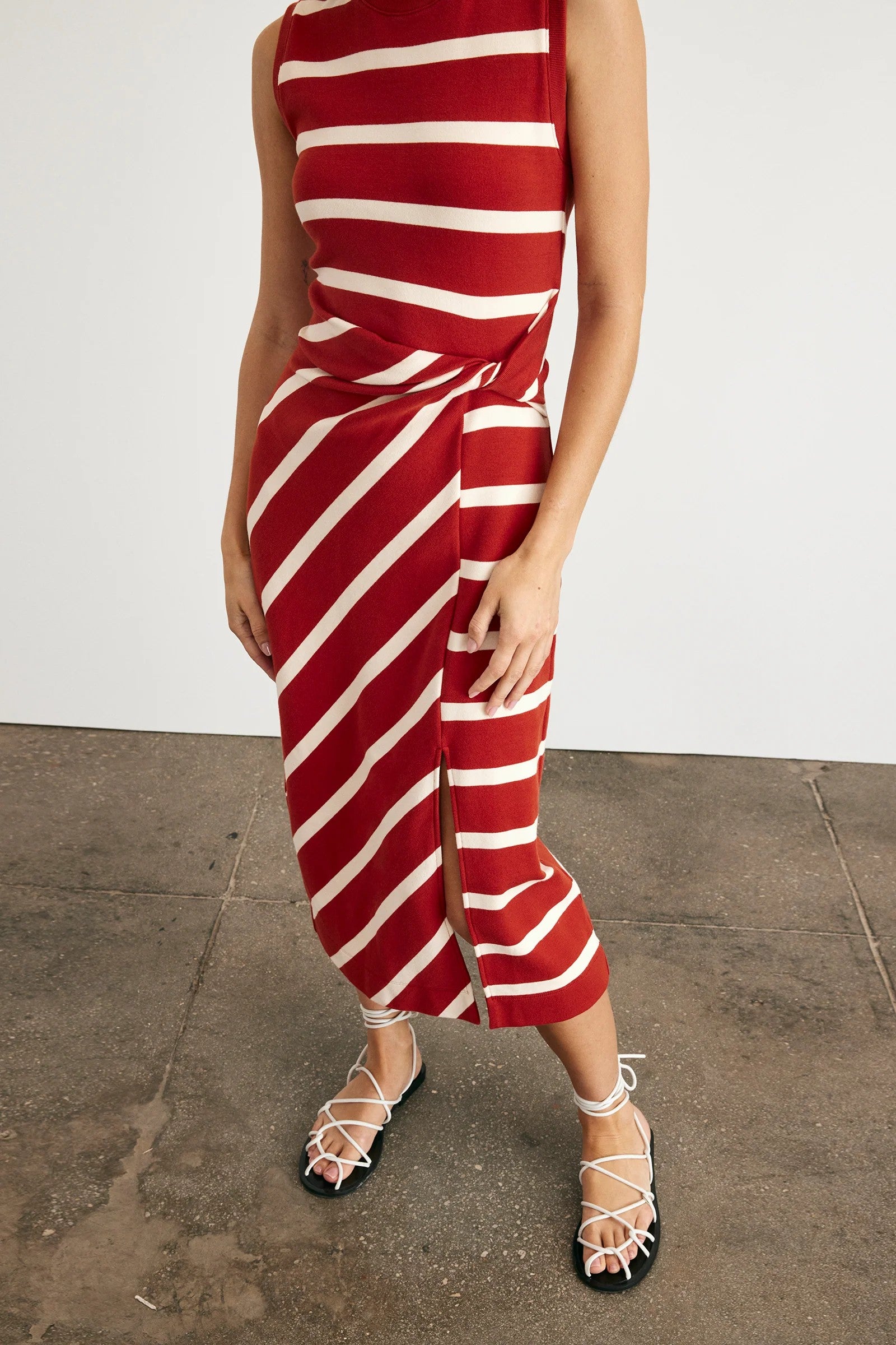 The Sleeveless Striped Cody Dress is fresh for Spring with the same signature figure-grazing silhouette in a new organic cotton rugby stripe. Featuring a side slit with a twist knot detail at the waist, Sleeveless Striped Cody is an ultra flattering style with a soft hand feel.