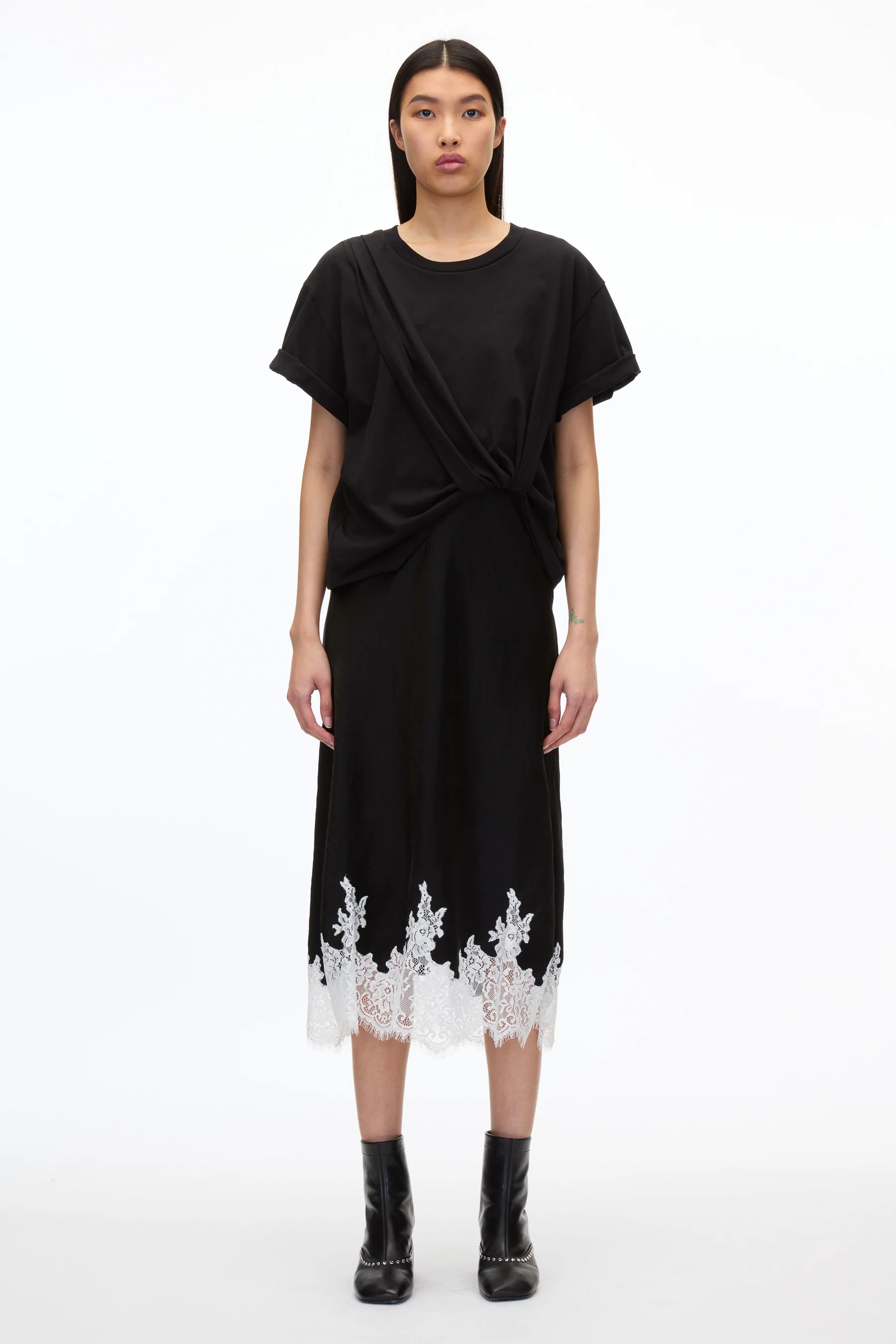 Combo dress with a draped front and tucked gathering at the waist. Features a jersey crewneck top with drop shoulders and short rolled sleeves. Satin skirt with mid length hemline and contrast lace trim. This style runs large, recommend ordering one size down.