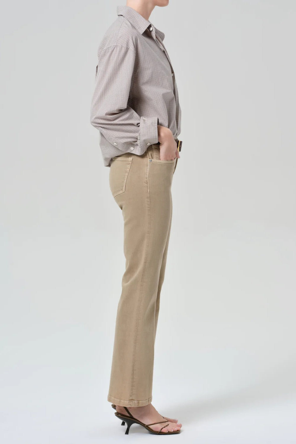 The Goldie offers a refined interpretation of ’70s-inspired denim. Designed with a mid rise and subtle kick-flare hem, the silhouette creates a long, balanced line that feels both timeless and modern. Crafted from our Signature soft stretch denim in the Catalina wash—a light-to-medium beige—it’s designed to hold its shape while maintaining a smooth, comfortable feel. The perfect balance of ease and sophistication for elevated everyday dressing.