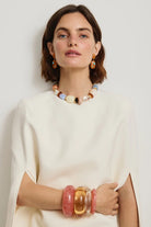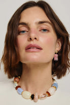 Observe the butterfly effect in a mixed-media collar necklace with the power to transform your wardrobe. With resin, freshwater pearl, angelite, rock crystal, carved chalcedony, peach calcite, and gold-plated beads, and cord toggle closure.
